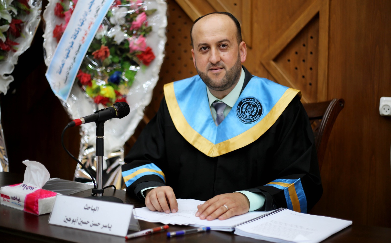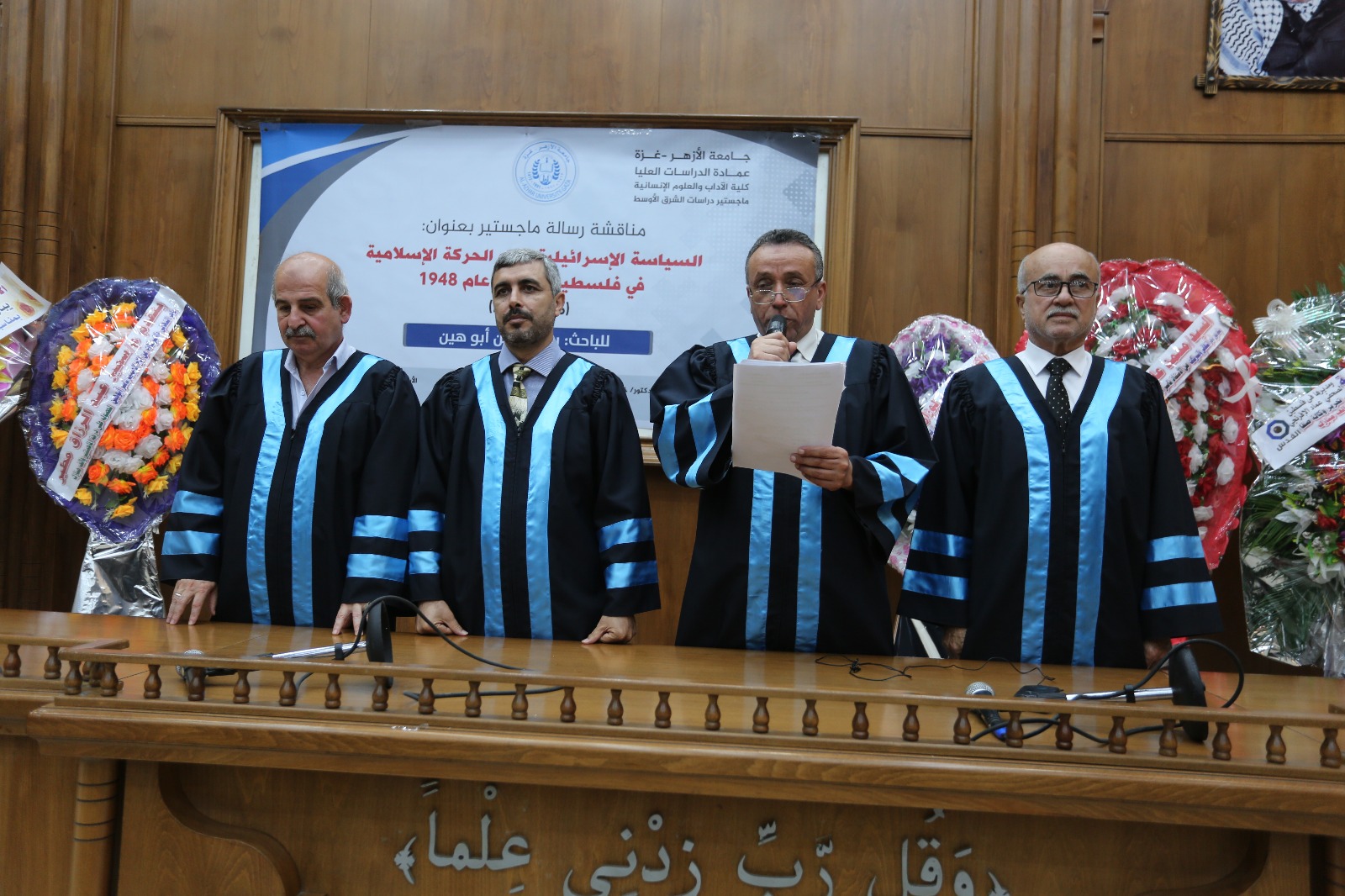 وأوصت لجنة المناقشة والحكم والتي تكونت من د. زهير المصري رئيس قسم التاريخ والعلوم السياسة في جامعة الأزهر "مشرفا رئيسيا"، ود. خالد شعبان مدير مركز التخطيط الفلسطيني "مشرفا ثانيا"، وأ.د أسامة أبو نحل "مناقشًا داخليًا"، وأ.د عبد الناصر الفرا "مناقشًا خارجيًا".