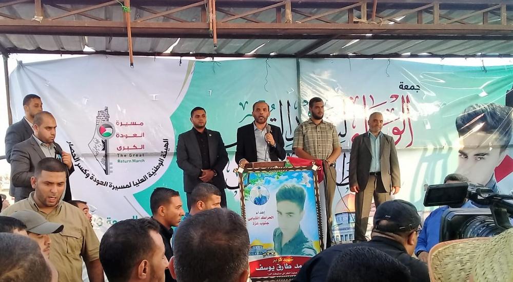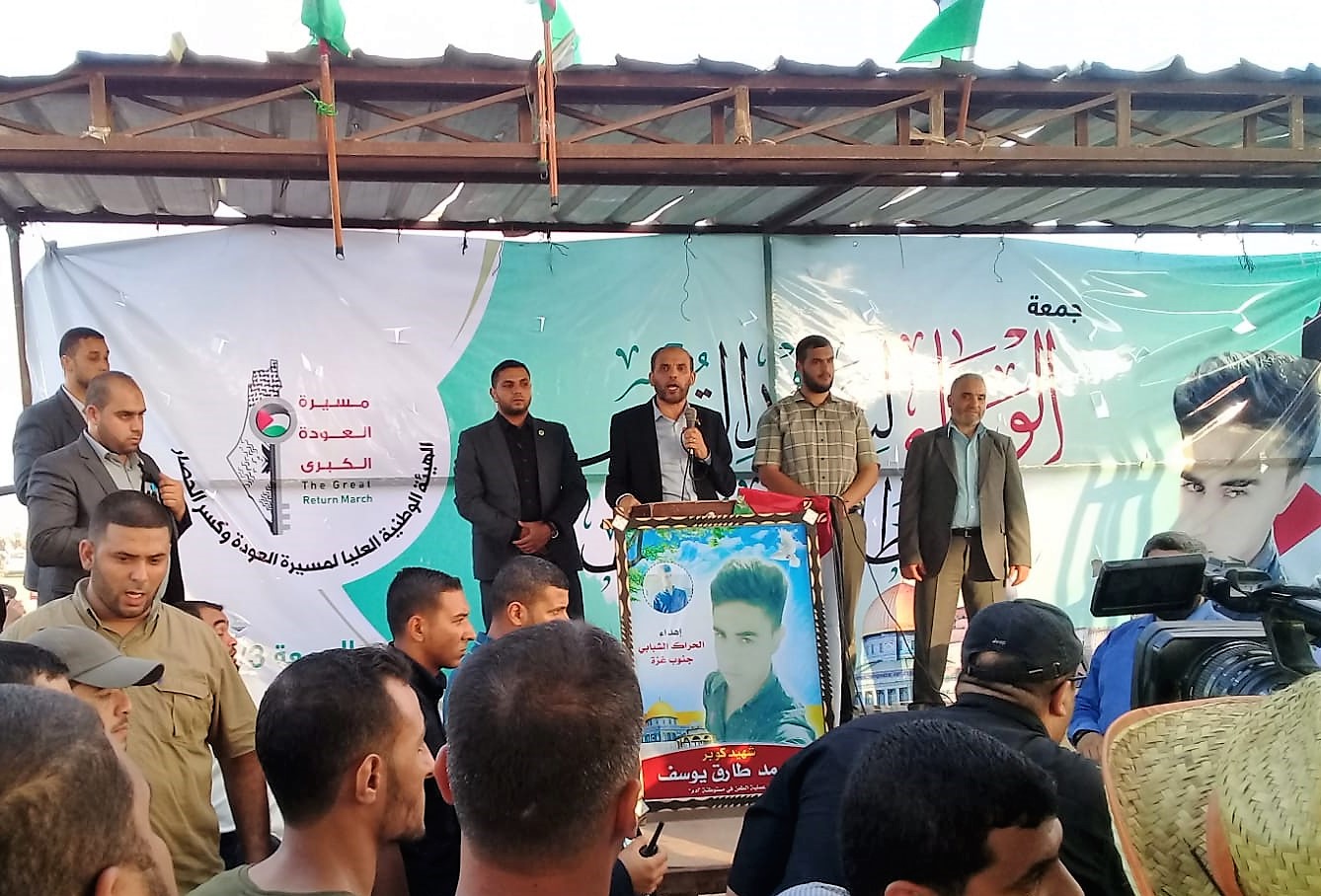 وفي السياق ذاته وخلال مشاركته في فعاليات المسيرة شرق مخيم البريج، قال عضو المكتب السياسي لحماس عزت الرشق إن مسيرات العودة الكبرى أسقطت صفقة القرن، وإن شباب غزة وشيوخها ونساءها يصنعون التاريخ بدمائهم وصمودهم وتضحياتهم.