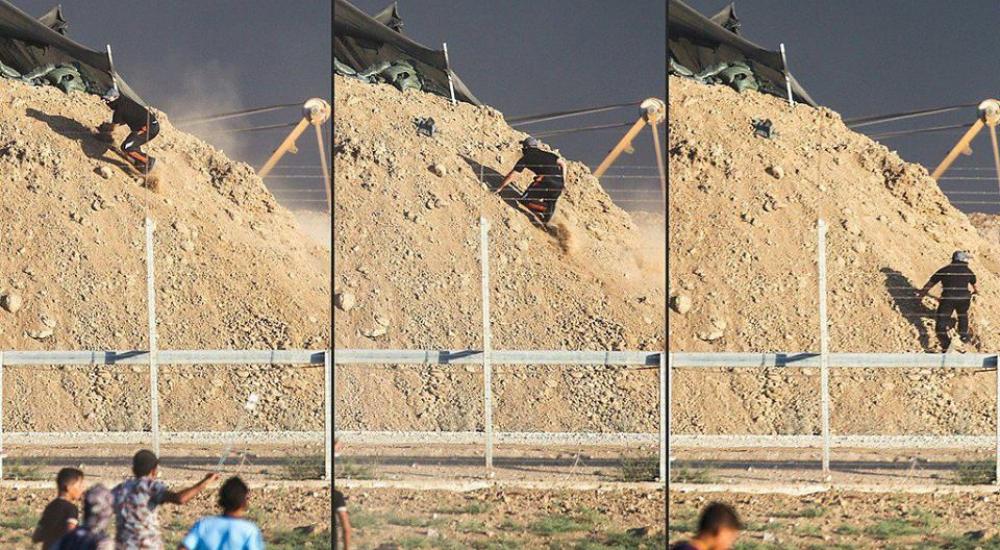 وفي مشهد لأول مرة أظهرت صور ومقاطع مصورة لشاب فلسطيني قام باجتياز السلك الالكتروني شرق مدينة غزة، والصعود لـتلة تعتليها دشمة قناصة الاحتلال ورشقهم بالحجارة من مسافة صفر ومن ثم عاد وسط إطلاق النار عليه بشكل كثيف.