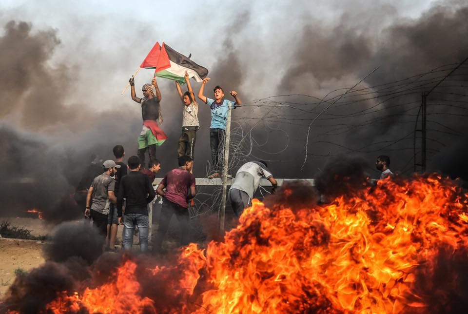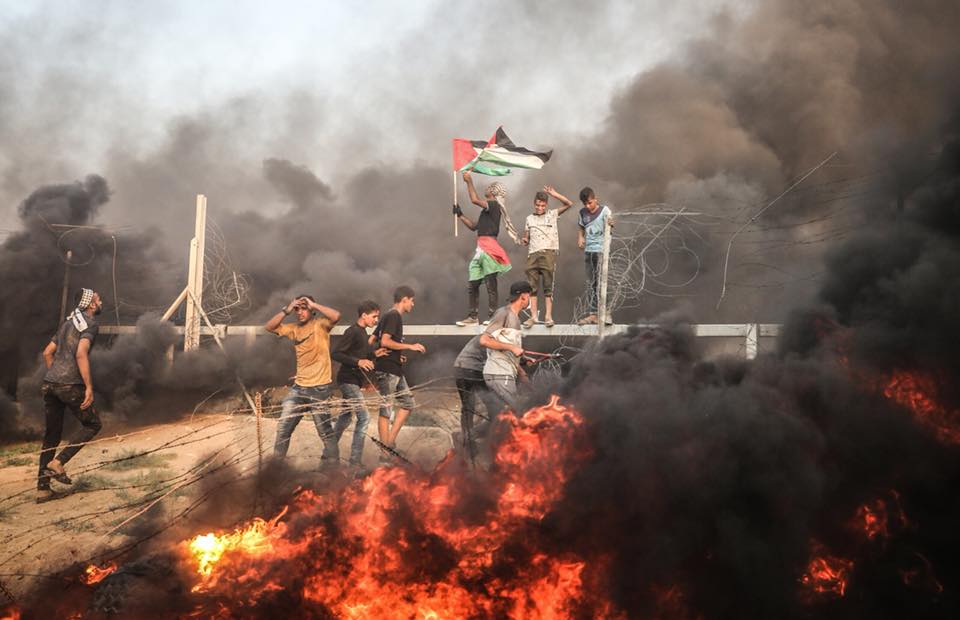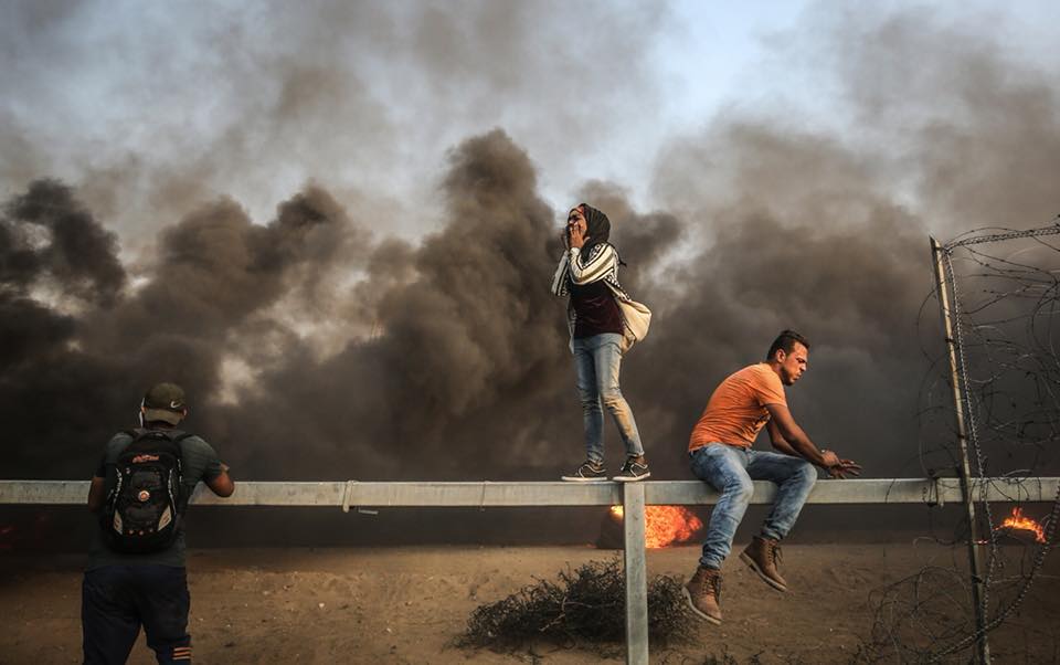 وأشعل الشبان عددًا كبيرًا من الإطارات المطاطية في محاولة للتغطية على قناصة الاحتلال ومنعهم من استهداف المتظاهرين سلميًا على حدود قطاع غزة الشرقية.