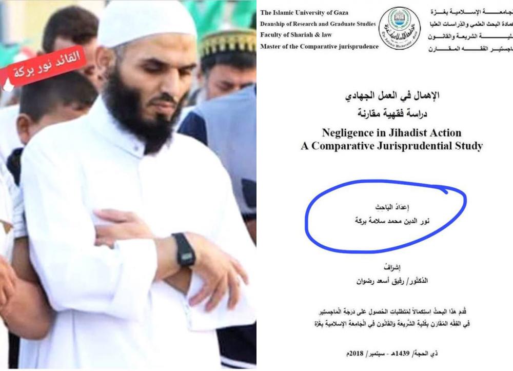 ارتقى مساء اليوم الأحد الشهيد القائد بكتائب الشهيد عز الدين القسام الجناح العسكري لحركة حماس نور بركة الحاصل على درجة الماجستير قبل أشهر في الفقه المقارن.