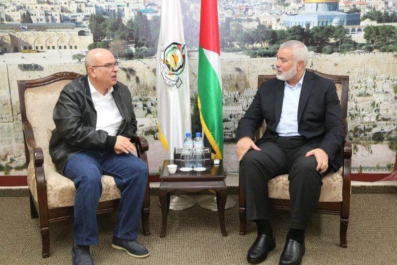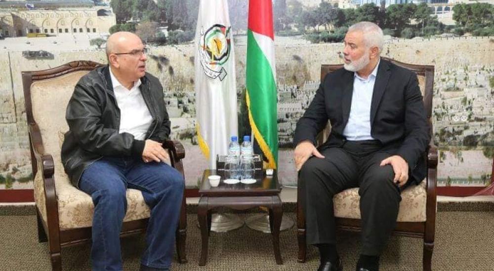 بحث رئيس المكتب السياسي لحركة "حماس" إسماعيل هنية الخميس، مع رئيس اللجنة القطرية لإعادة إعمار قطاع غزة السفير محمد العمادي، آخر التطورات السياسية الفلسطينية.