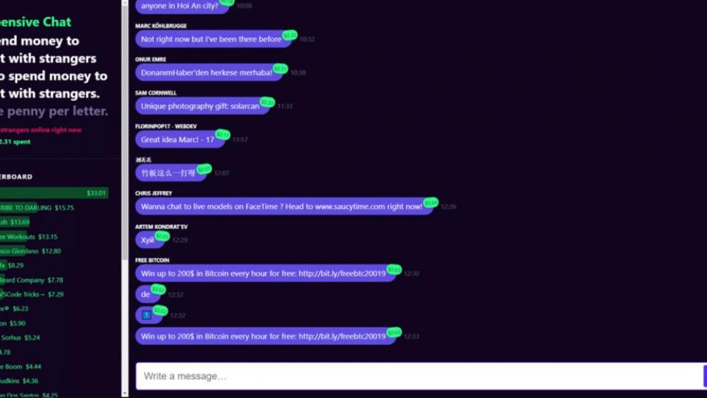 أطلق رائد أعمال هولندي اسمه مارك كولبروجه خدمة للدردشة المدفوعة على الويب، باسم "الدردشة المكلفة" Expensive Chat، حيث يجب عليك دفع بنس أو ما يُعادل 0.01 دولار أميركي مقابل كل حرف تكتبه.