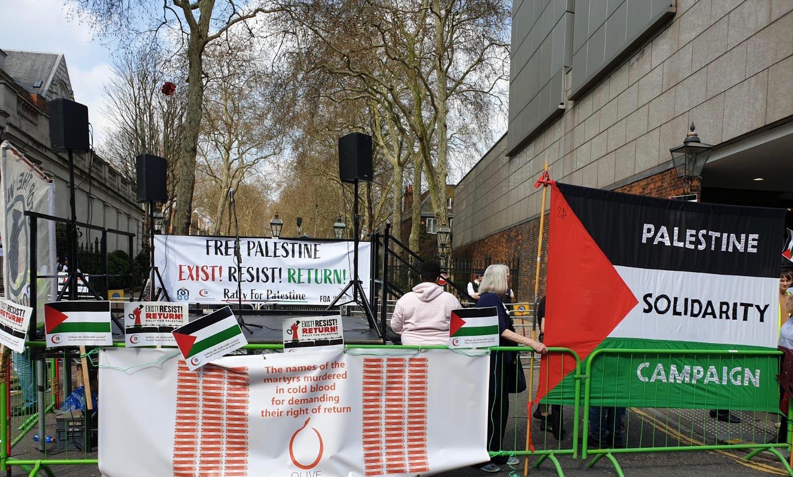 نظم المنتدى الفلسطيني في بريطانيا مظاهرة أمام السفارة الإسرائيلية في لندن، بالتعاون مع عدد من المنظمات التضامنية البريطانية وفي مقدمتها "حملة التضامن" وحملة "أوقفوا الحرب" والرابطة الإسلامية و"أصدقاء الأقصى".