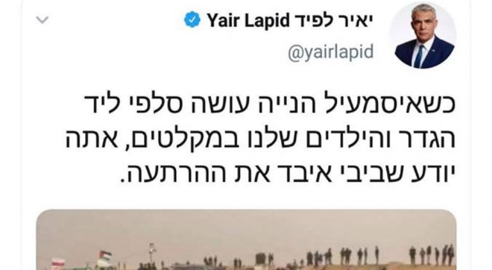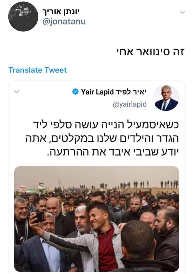 وكتب لبيد على صفحته وفوق صورة السنوار ما نصه "عندما يقوم إسماعيل هنية يأخذ سلفي بالقرب من السياج وأولادنا في الملاجئ فاعلم بأن بيبي قد فقد الردع".