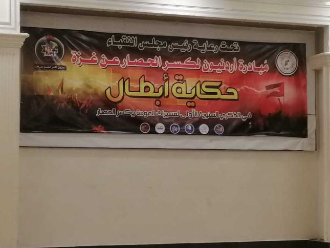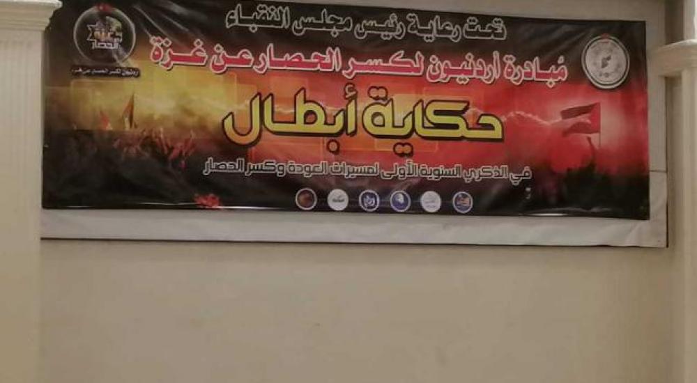 نظمت مبادرة أردنيون لكسر الحصار عن غزة في مقر النقابات الأردنية بعمّان الجمعة، احتفاليّة لدعم صمود غزة أمام الاحتلال الإسرائيلي بعنوان "حكاية أبطال"، وذلك بمناسبة حلول الذكرى السنوية الأولى لانطلاق مسيرات العودة وكسر الحصار عن غزة.