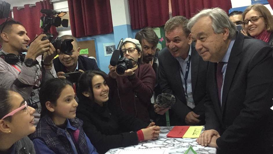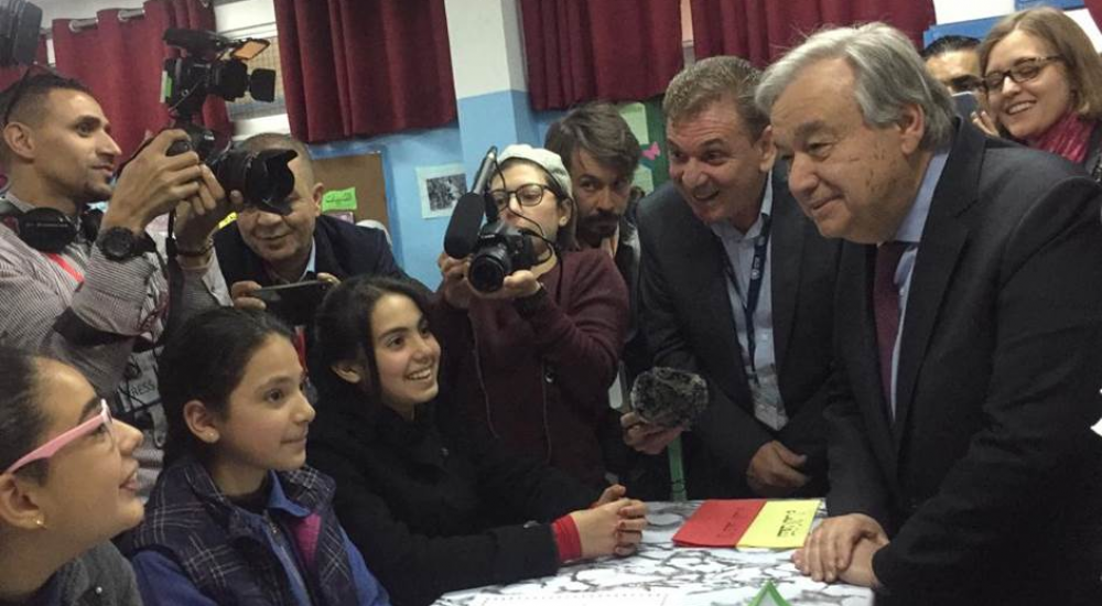 زار الأمين العام للأمم المتحدة أنطونيو غوتيريس يرافقه المفوض العام لوكالة غوث وتشغيل اللاجئين الفلسطينيين (أونروا) بيير كرينبول يوم السبت مخيم البقعة للاجئين في الأردن، والذي يعيش فيه نحو 120 ألف لاجئ من فلسطين.