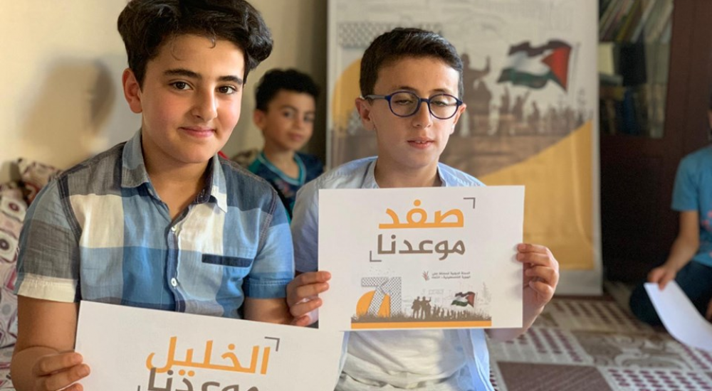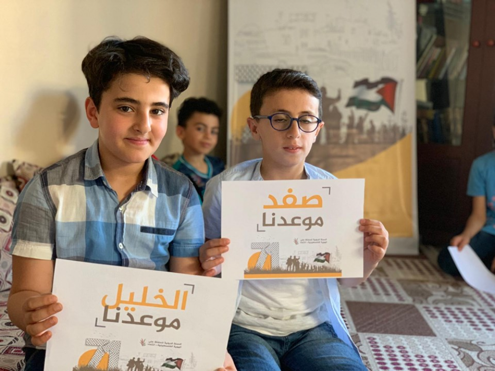 ورفع الأطفال يافطات بأسماء المدن الفلسطينية التي ينتمون لها، مؤكدين على حقهم في العودة إلى قراهم ومدنهم الفلسطينية التي هجروا منها عام 1948.