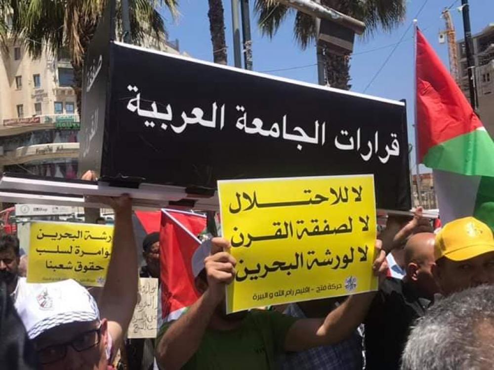 وفي جامعة الخليل، أحرق نشطاء في الشبيبة الفتحاوية صورًا لزعماء عرب وعلمي إسرائيل والبحرين أمام الجامعة، بعد مهرجان خطابي جدد فيه الطلبة رفضهم لمؤتمر المنامة وصفقة القرن.