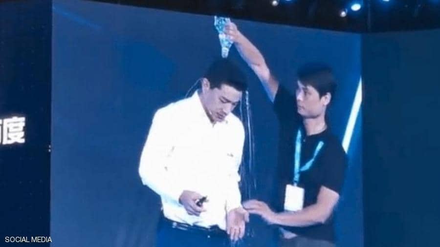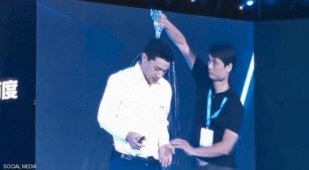 سكب شاب زجاجة ماء فوق روبين لي الرئيس التنفيذي لشركة بايدو الصينية خلال حفل افتتاح مؤتمر سنوي تنظمه شركة البحث العملاقة الأربعاء.