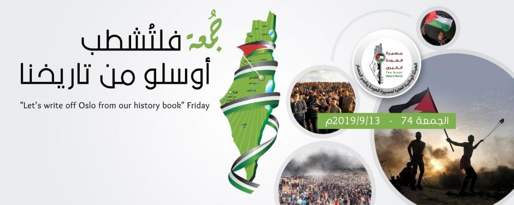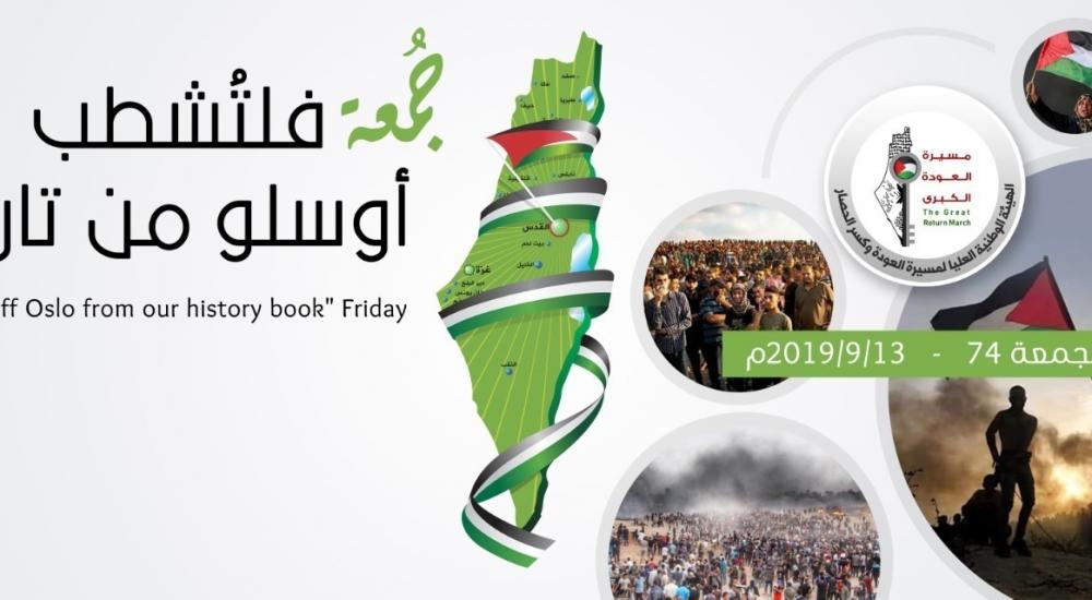 ودعت الهيئة الوطنية العليا لمسيرات العودة الكبرى وكسر الحصار في بيان صحفي، جماهير شعبنا إلى المشاركة الحاشدة في فعاليات هذه الجمعة التي تحمل عنوان "فلتشطب أوسلو من تاريخنا"، ردا على مشاريع الإدارة الأمريكية التصفوية ورفضا لمخططات الاحتلال.