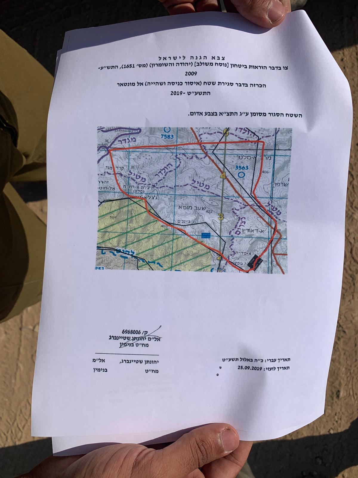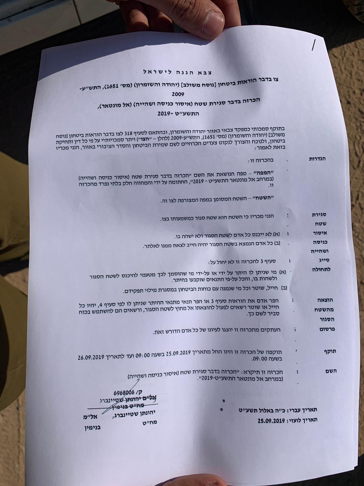 وأضاف "موظفي إدارة الاحتلال المدنية سلموا المعتصمين بالخيمة قرارًا عسكريا من الإدارة يقضي بإغلاق المنطقة لمدة ٢٤ ساعة، مرفق بخريطة لبرية السواحرة في منطقة المنطار".