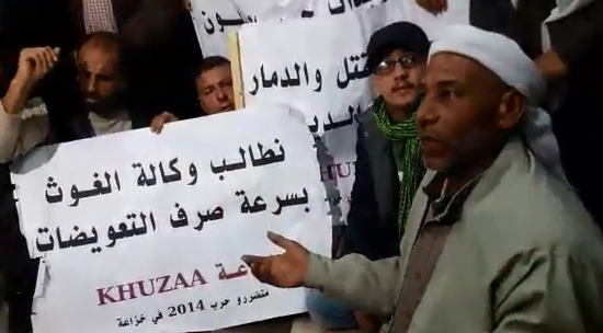 ورفع المحتجون لافتات كُتب عليها "وعود وكالة الغوث ورطتنا في الديون"، "انتهت حرب القتل والدمار وبدأت حرب الديون"، "نطالب الوكالة بسرعة صرف التعويضات"، "سارعوا بصرف التعويضات فبرد الشتاء لا يحتمل"، "أين تذهب أموال المانحين يا وكالة الغوث؟".