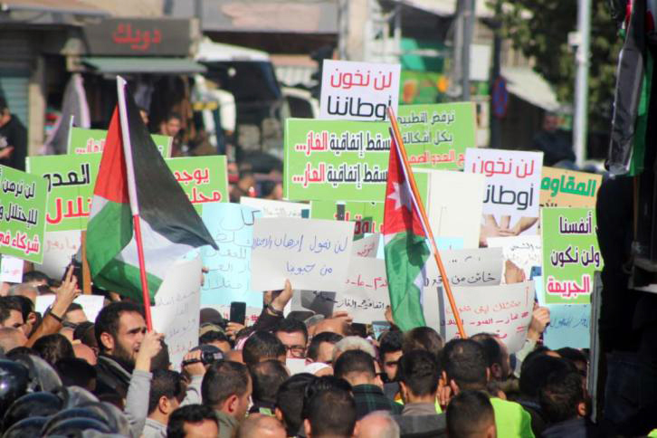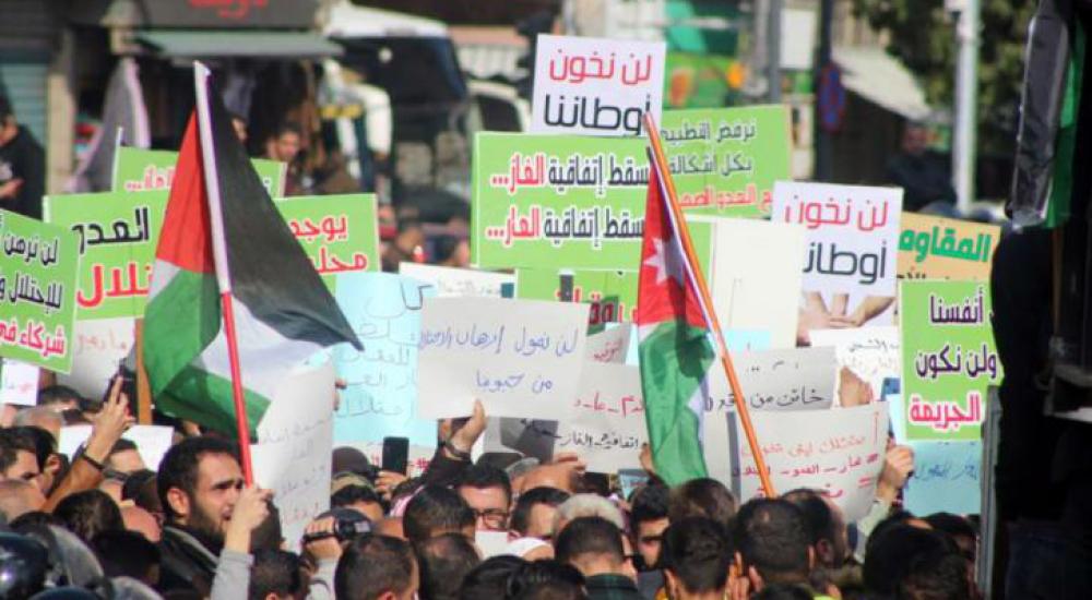 وطالب المشاركون في الاحتجاجات بطرد السفير الإسرائيلي وقطع العلاقات مع الاحتلال الإسرائيلي وإلغاء معاهدة وادي عربة، مؤكدين وقوف الأردنيين ضد هذه الصفقة.