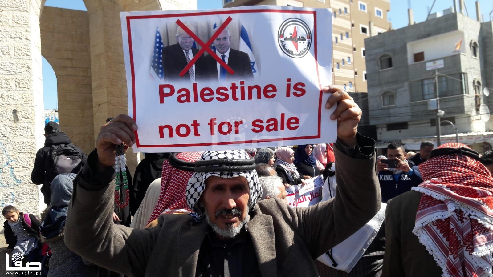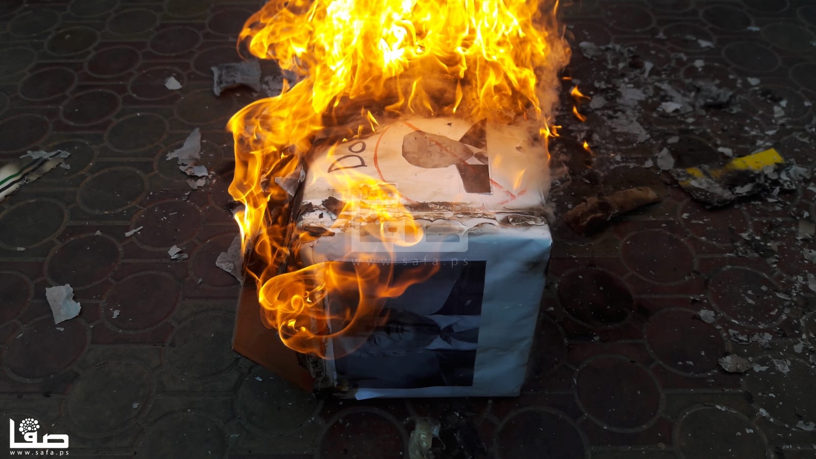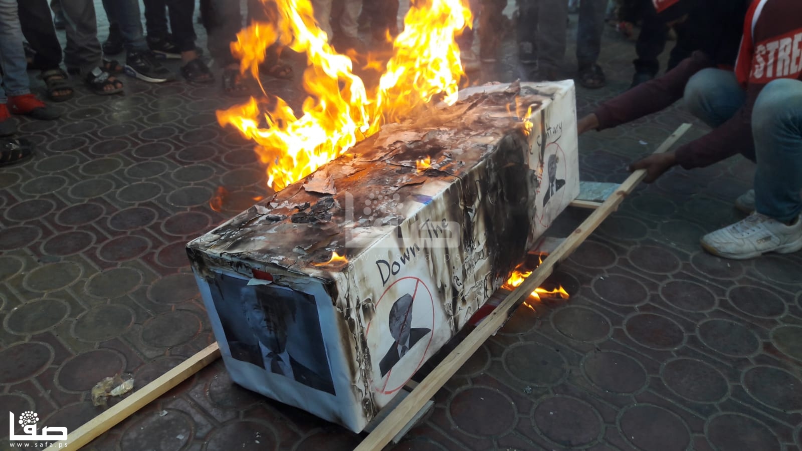 وأحرق غاضبون خلال الوقفة، "تابوت عليه صور الرئيس الأمريكي"، فيما رفع المشاركون لافتات، كُتب عليها: "تسقط صفقة القرن، ستبقى القدس عاصمتنا الأبدية، الأمم المتحدة مطالبة بالتحرك لنصر القضية الفلسطينية، بالوحدة والمقاومة تسقط الصفقة، حق العودة مقدس لا تستطيع أميركا إسقاطه".