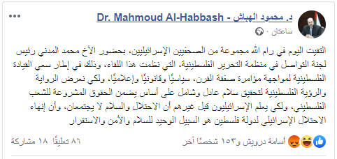 وكتب الهباش على صفحته ب"فيسبوك" مساء اليوم "التقيت اليوم في رام الله مجموعة من الصحفيين الإسرائيليين بحضور الأخ محمد المدني رئيس لجنة التواصل في منظمة التحرير الفلسطينية التي نظمت هذا اللقاء".
