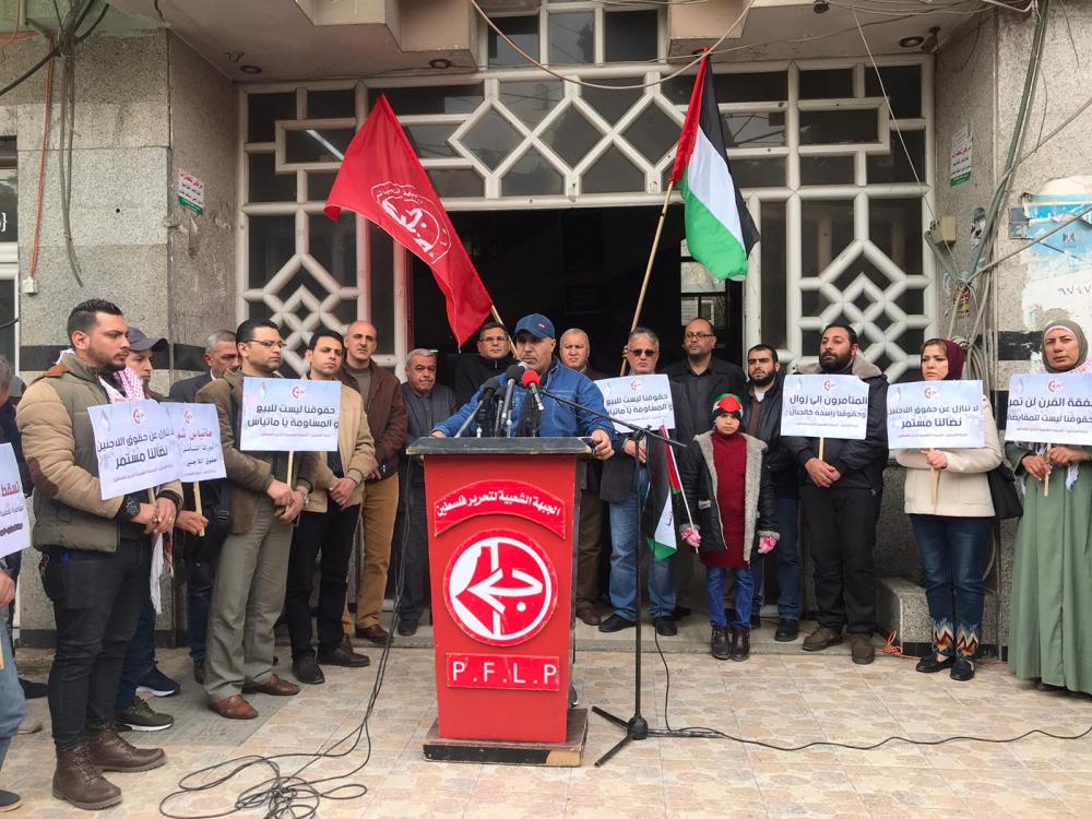 وقال عضو اللجنة المركزية العامة للجبهة الشعبية هاني الثوابتة في كلمته خلال الوقفة: إن" إدارة وكالة الغوث بدأت بإجراءات متدرجة وتقليصات في قطاعات الصحة والتعليم والخدمات والجوانب الاغاثية، تستهدف بشكل واضح حقوق اللاجئين وحق العودة".