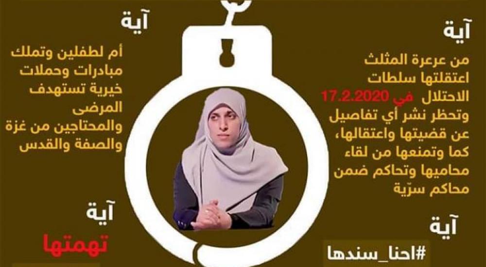 وتضمنت الحملة مناشدة للمؤسسات الحقوقية والنسوية بضرورة الضغط على الاحتلال الإسرائيلي من أجل الإفراج عنها فوراً، علماً أنها متزوجة وأم لطفلين أكبرهما في السابعة من عمره.