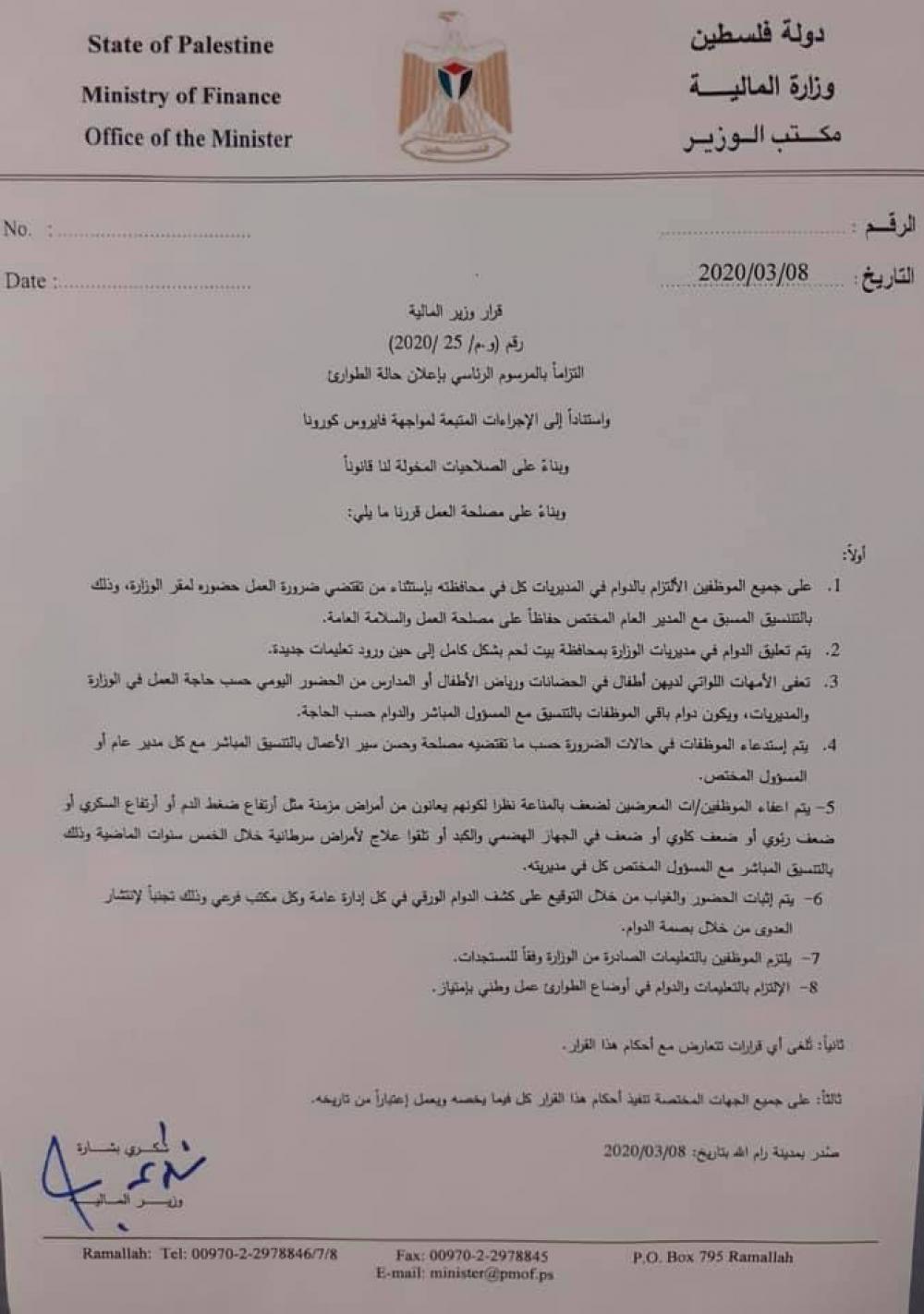 قرر وزير المالية الفلسطيني شكري بشارة مساء يوم الأحد إعفاء الموظفات الأمهات اللواتي لديهن أطفال في الحضانات أو الروضات أو المدارس من الحضور اليومي حسب حاجة العمل وبالتنسيق مع المسؤول المباشر في الوزارة.