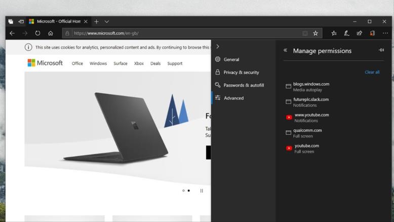 يمكن لأشخاص يعتمدون على متصفح إيدج "Edge" من ميكروسوفت التحقق من أذونات الموقع من خلال النقر على رمز القفل أو رمز "i" على يسار شريط العناوين. يمكنك إلغاء أي أذونات منحتها بالفعل بالنقر فوق مفتاح التبديل.