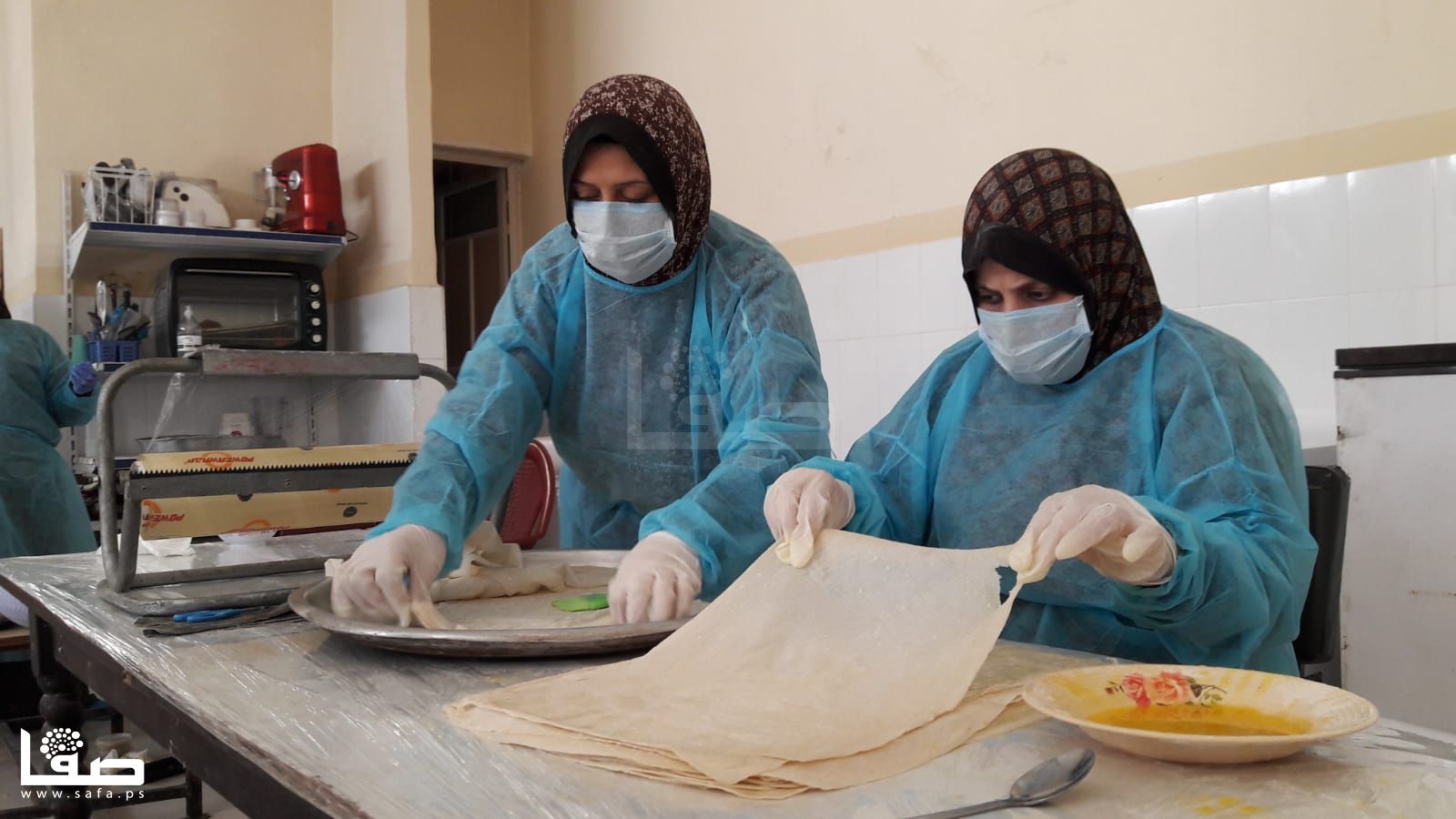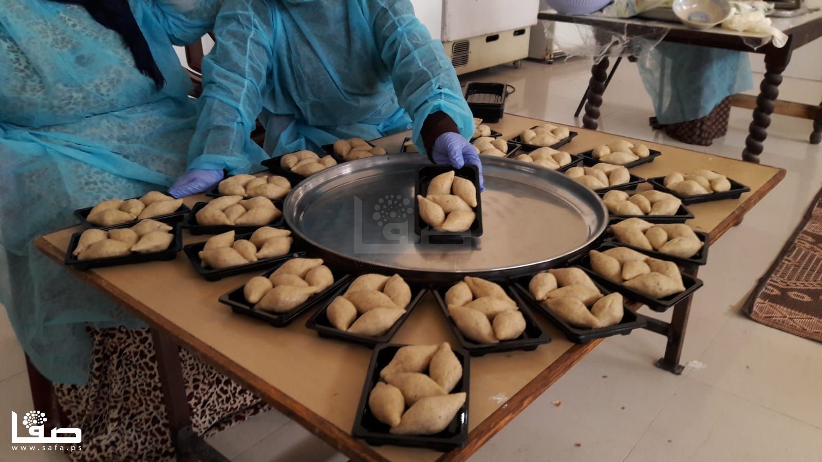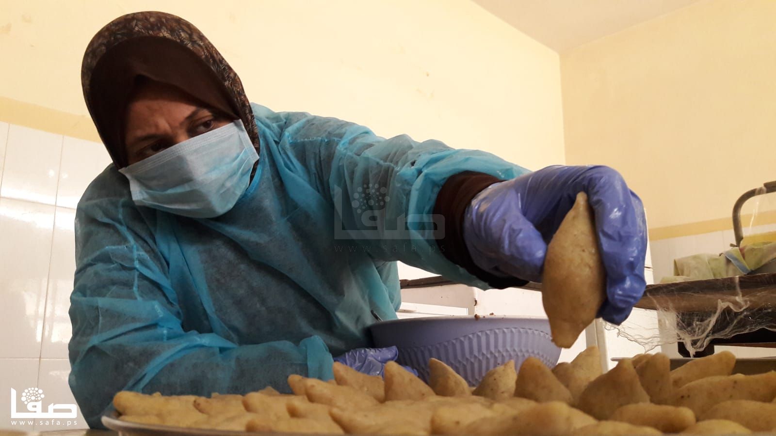 تنهمك نسرين اربيع (34عامًا) في تحضير كميات كبيرة من "السمبوسك" مع عشرة أخريات من زميلاها اللواتي يتعاونّ لتجهيز وصفاتٍ رمضانية أخرى ووضعها على الرفوف وفي الثلاجات لتوزيعها لاحقًا على المتاجر، وذلك في مطبخٍ مؤسساتي بخان يونس.