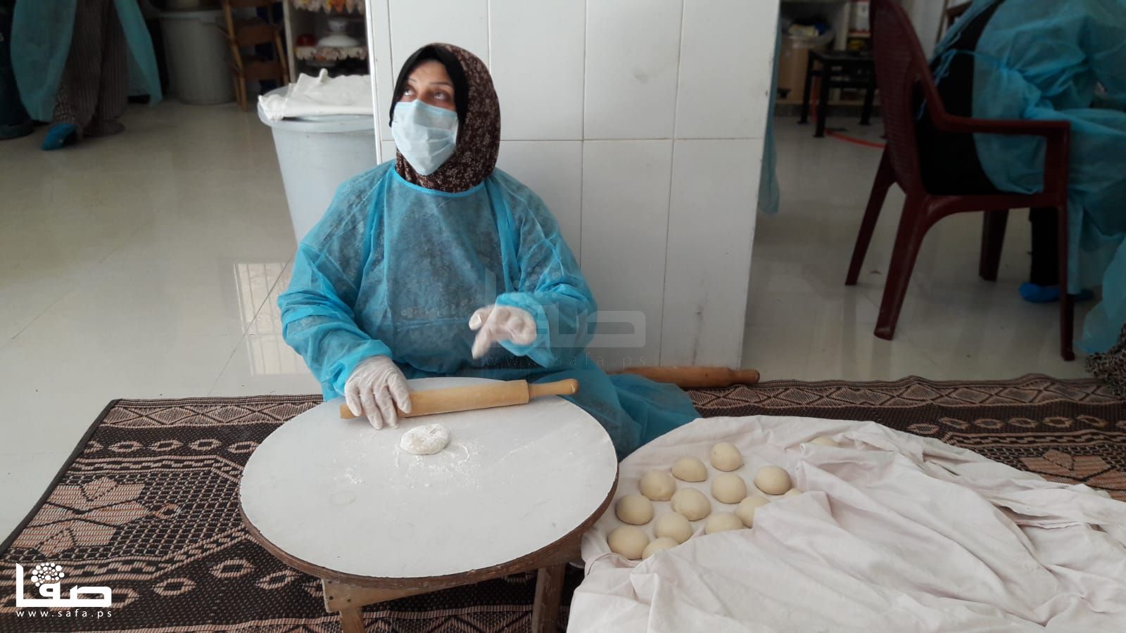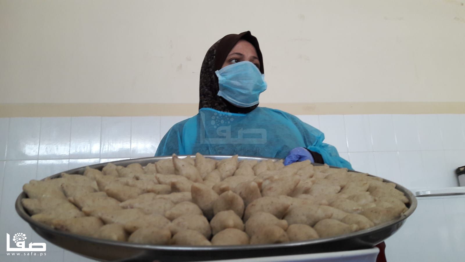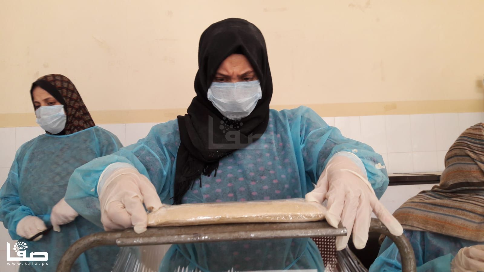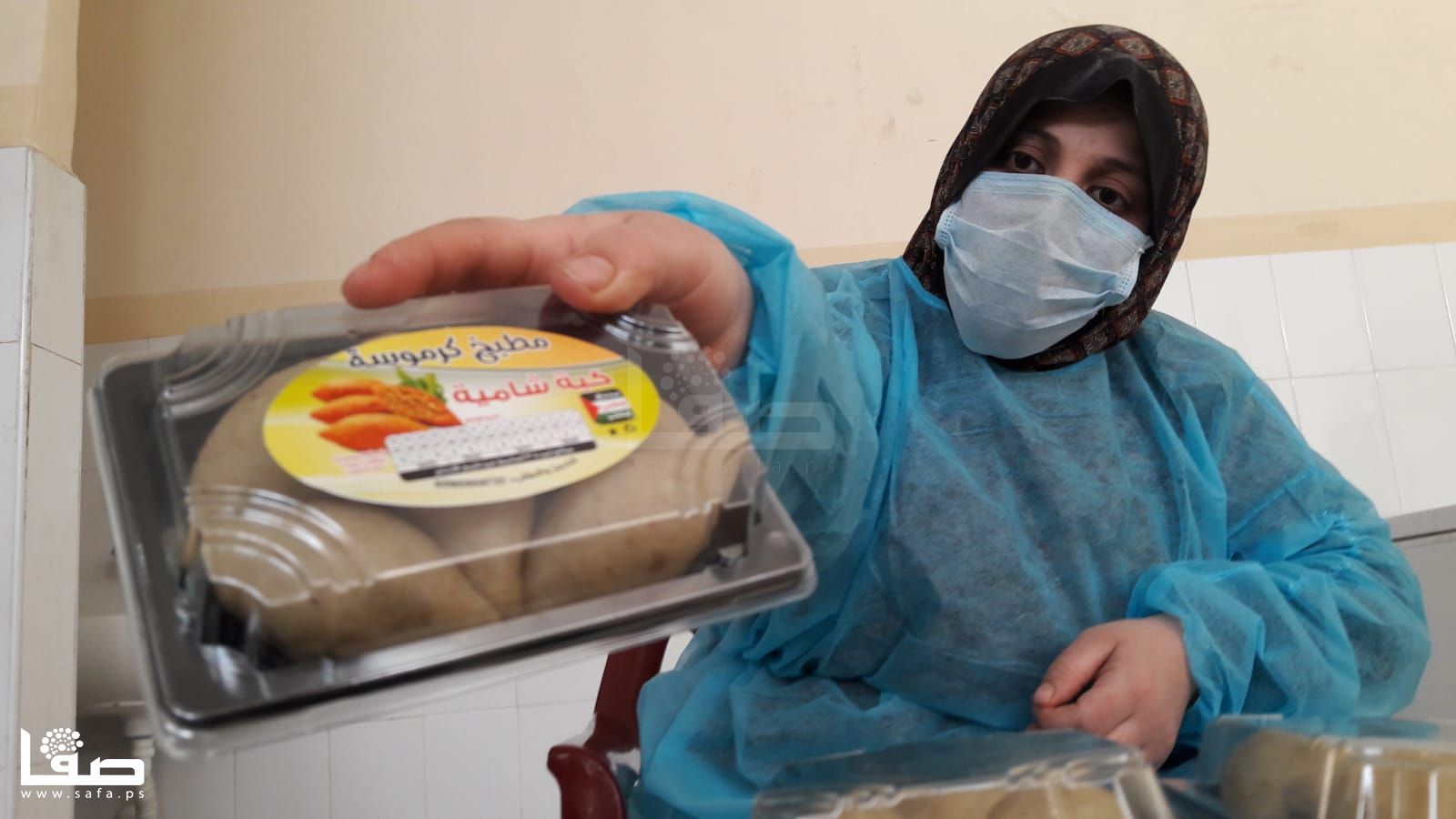 كما أنها لم تعتدّ على ارتداء كمامة الوجه التي تزيلها بين فينة وأخرى لتنال قسطًا من الراحة وتستنشق هواءً بمعزل عن تلك الكمامة ثم تعود للعمل مُجدّدًا؛ كما الحال لباقي زميلاتها اللواتي اعتدنّ على أن تمزج أيديهنّ بالزبدة والدقيق وبقية مكونات صناعة الكبة والسمبوسك والمفتول.