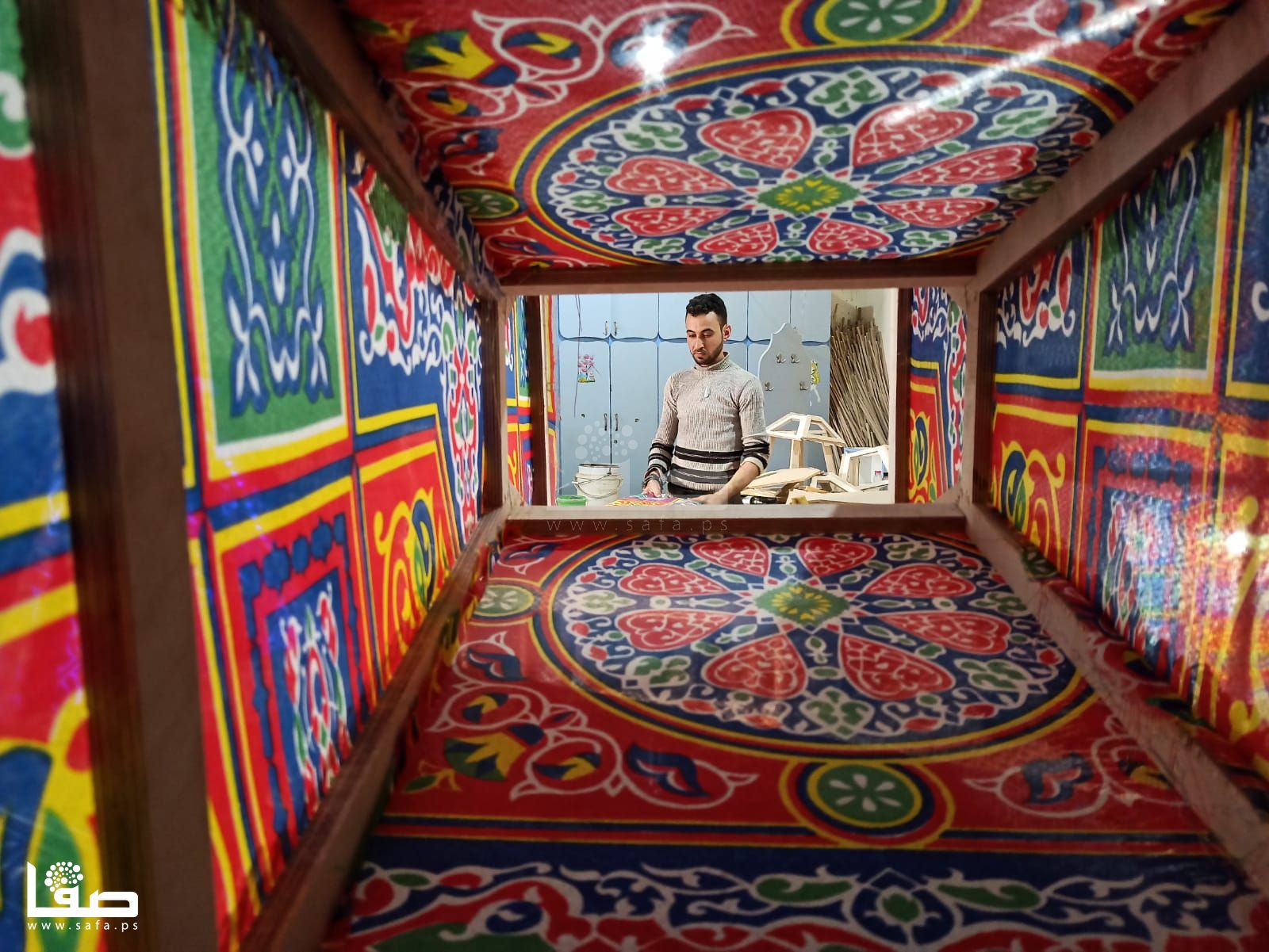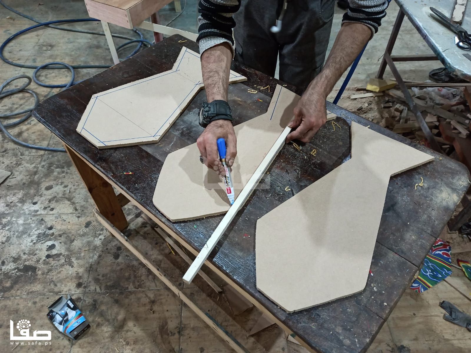 ويستخدم "محمد" القطع الخشبية باختلاف أنواعها، ويقوم بقصها بشكلٍ مُتقن، وتثبيتها بمسامير صغيرة أو دبابيس لتقوية قطع المجسم، ثم يكسوها بقماش زينة المناسبات المصرية والتي باتت تستخدم لاحقًا في المناسبات الفلسطينية خاصة الأفراح، مع نقش كلمات : "رمضان كريم، كل عام وأنتم بخير"، عليها.