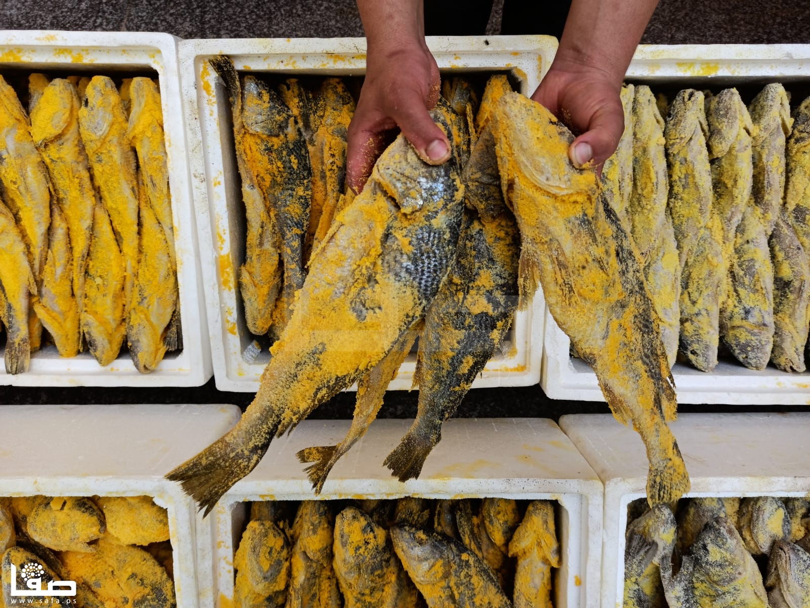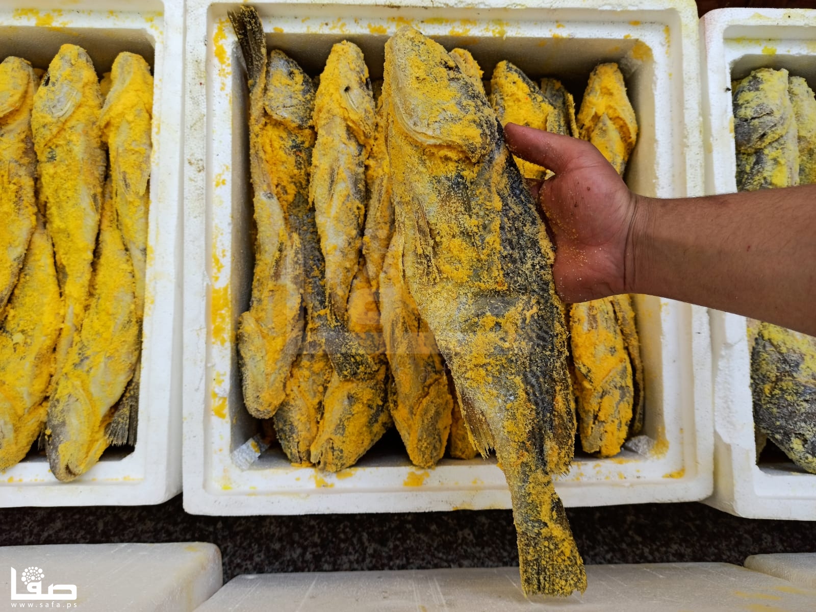 يُخرج أبو حصيرة "الفسيخ" من البراميل قبل العيد بأيام، ويغسله جيدًا، ثم يضع الملح الممزوج بأصباغ ليكسبه لونًا جذابًا، قبل وضعه في صناديق؛ تمهيدًا لعرضه في السوق".