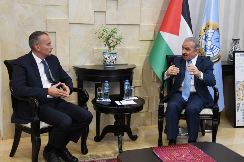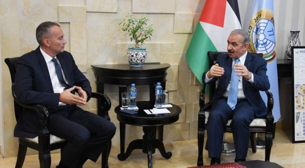 بحث رئيس الوزراء محمد اشتية مع منسق الأمم المتحدة الخاص لعملية التسوية في الشرق الأوسط نيكولاي ميلادينوف يوم الخميس، مواجهة التهديد الإسرائيلي بضم أجزاء من الضفة الغربية، في مكتبه بمدينة رام الله وسط الضفة الغربية المحتلة.