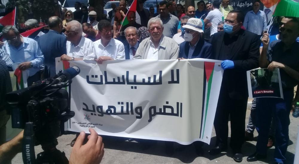 نظمت القوى الوطنية ظهر الاثنين وقفة وسط مدينة رام الله وسط الضفة الغربية المحتلة، رافضًا لمخطط الضم المنوي الشروع به بداية الشهر القادم.