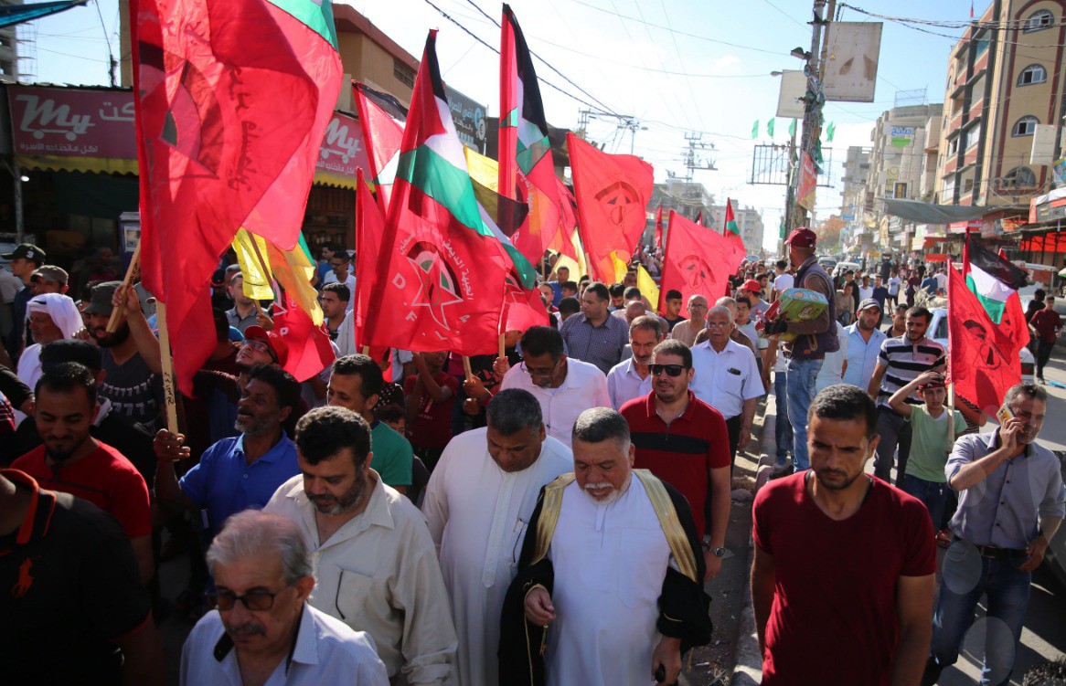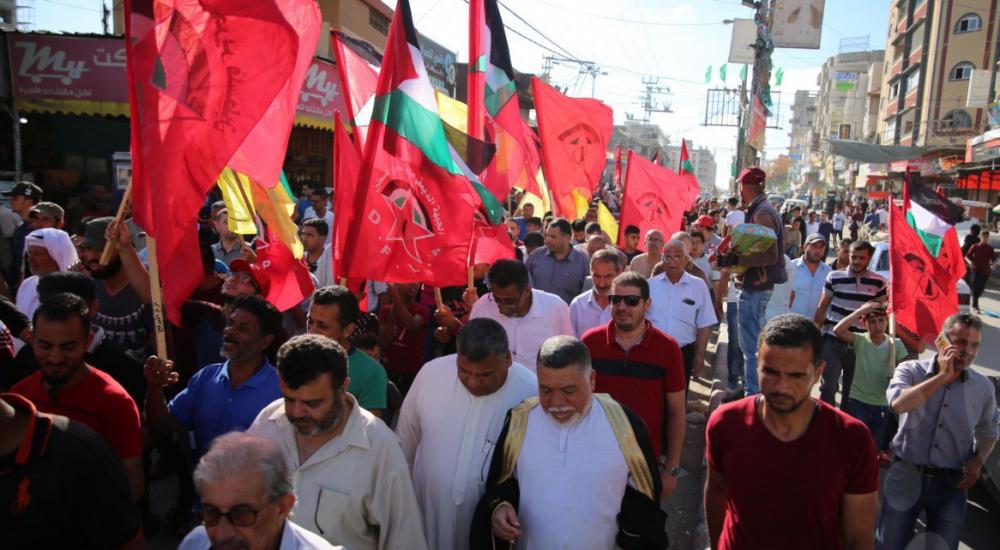 نظمت الجبهة الديمقراطية لتحرير فلسطين مسيرة جماهيرية حاشدة بعنوان «بالوحدة والمقاومة نسقط صفقة ترامب- نتنياهو ومخطط الضم»، الأربعاء، انطلقت من مدخل مخيم النصيرات للاجئين الفلسطينيين وسط قطاع غزة، بحضور جماهيري وفصائلي.
