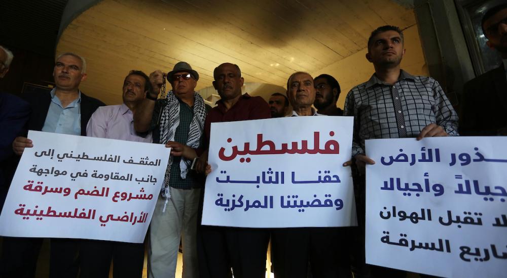 وقال عوض الله في تصريح "إن هناك موقف إجماع وطني رافض لكل المشاريع الصهيونية والأمريكية التي تستهدف حقوقنا وفي المقدمة منها صفقة القرن والتي تأتي خطوة الضم الصهيونية التي يهدد الاحتلال بتنفيذها جزءاً لا يتجزأ من الإجراءات الصهيونية على الأرض".