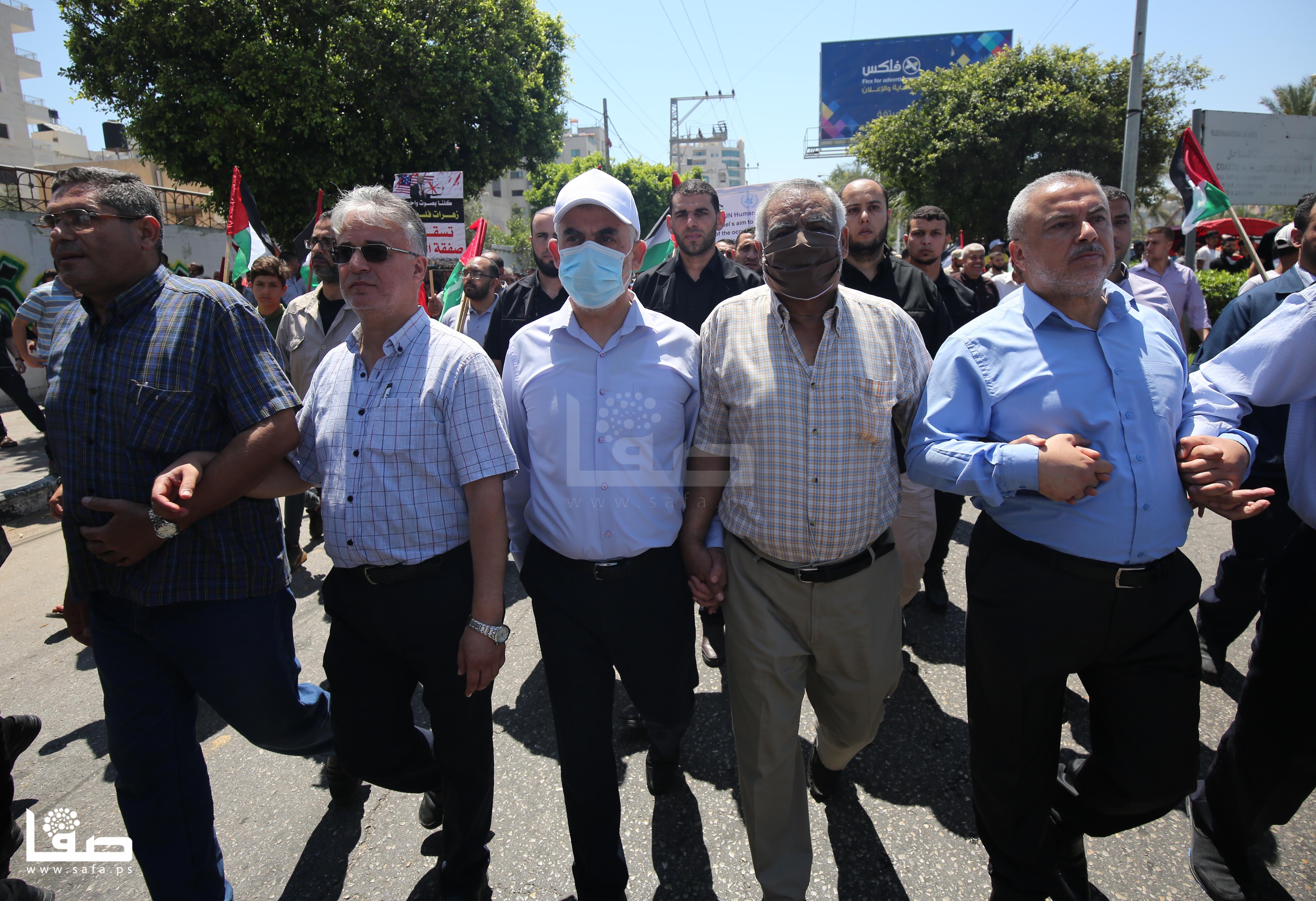 وأوضح المراسل أن قائد حركة حماس في قطاع غزة يحيى السنوار شارك في المسيرة إلى جانب عدد من القيادات الفصائلية، وأبرزهم عضو اللجنة المركزية لحركة فتح مفوض التعبئة والتنظيم في المحافظات الجنوبية أحمد حلس، وعضو المكتب السياسي لحركة الجهاد الإسلامي خالد البطش.