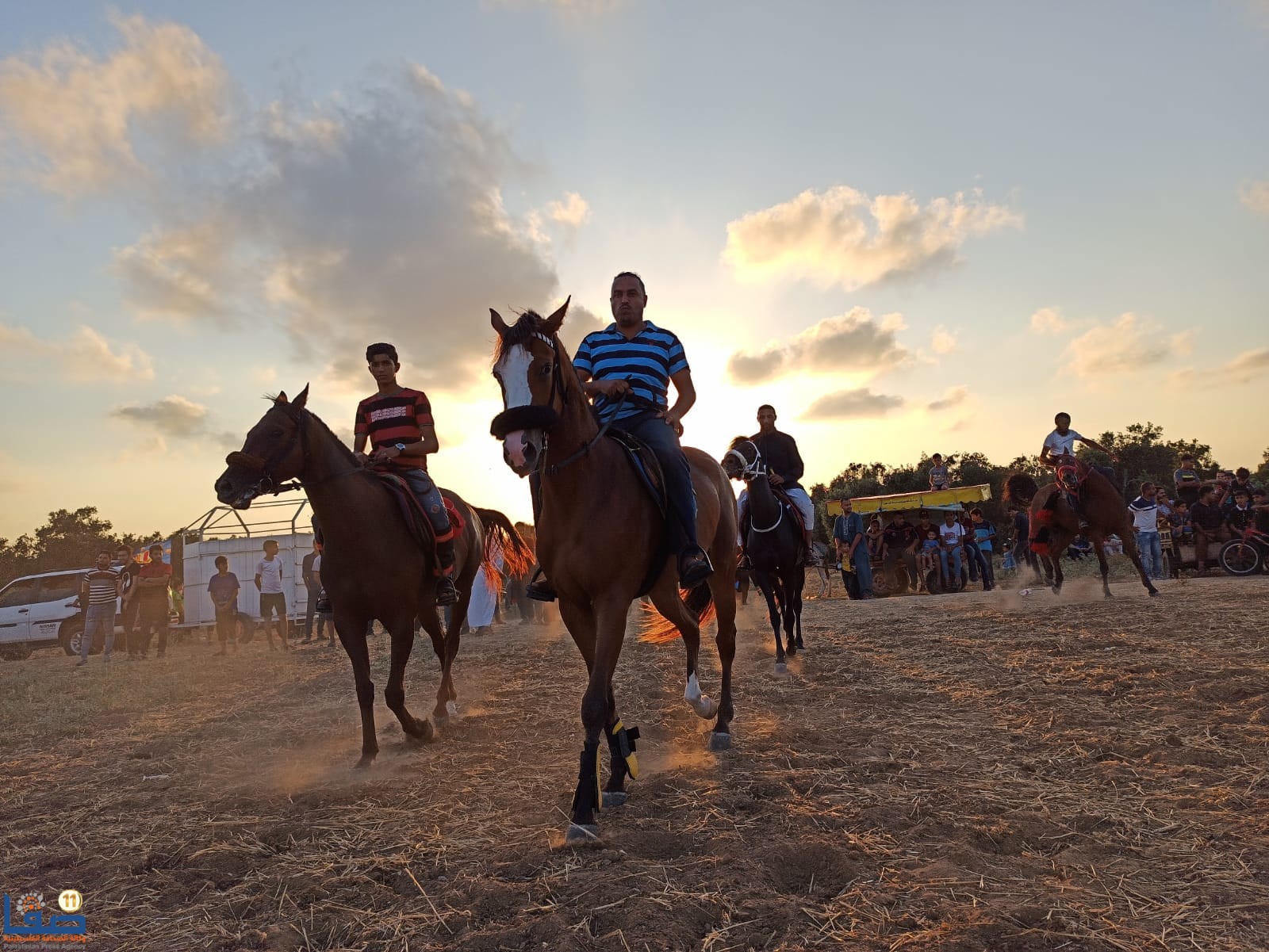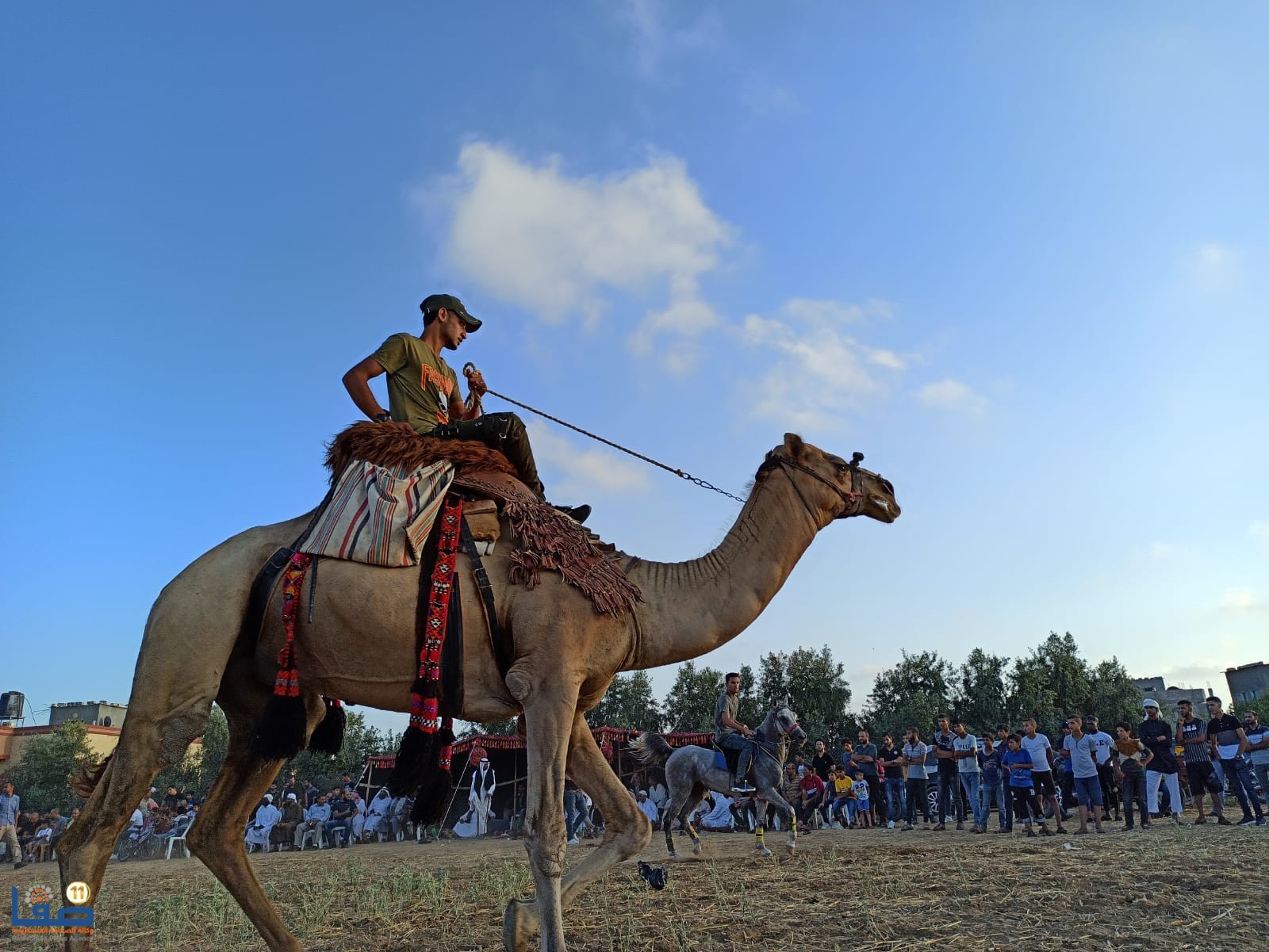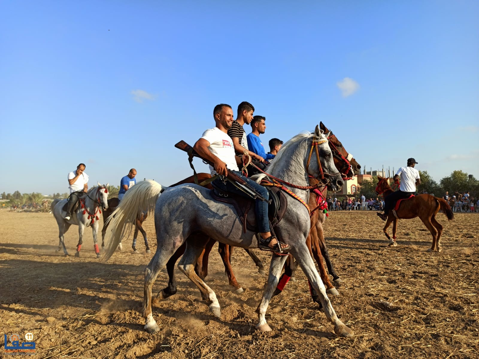 فما إن انتهت صلاة العصر، توجه المهنئون، لتهنئة والد العريس ونجله، وجلسوا في بيتٍ من الشعر، فيما اهتزت الأرض الترابية الواسعة بضربات حوافر الخيل المسرعة أمام باحة الخيمة. إنهم "خيل الصابية".