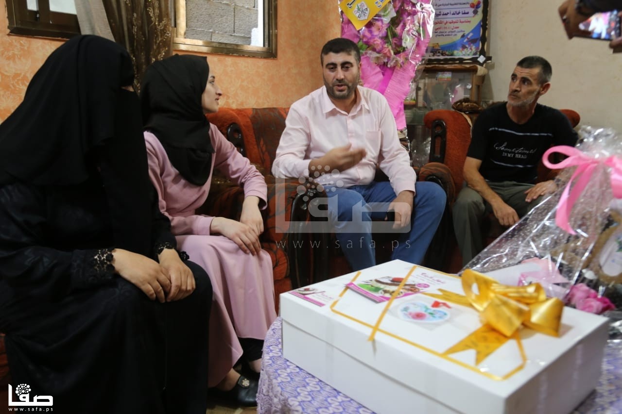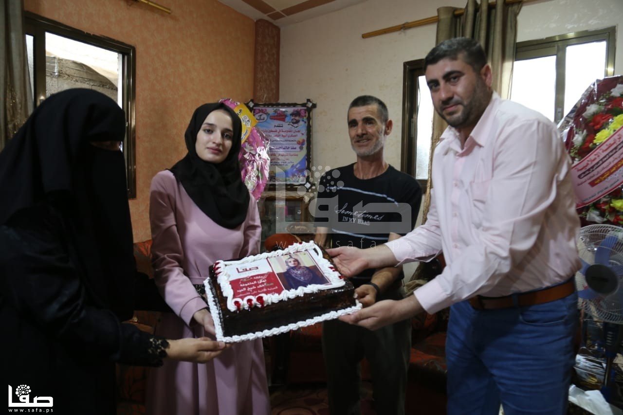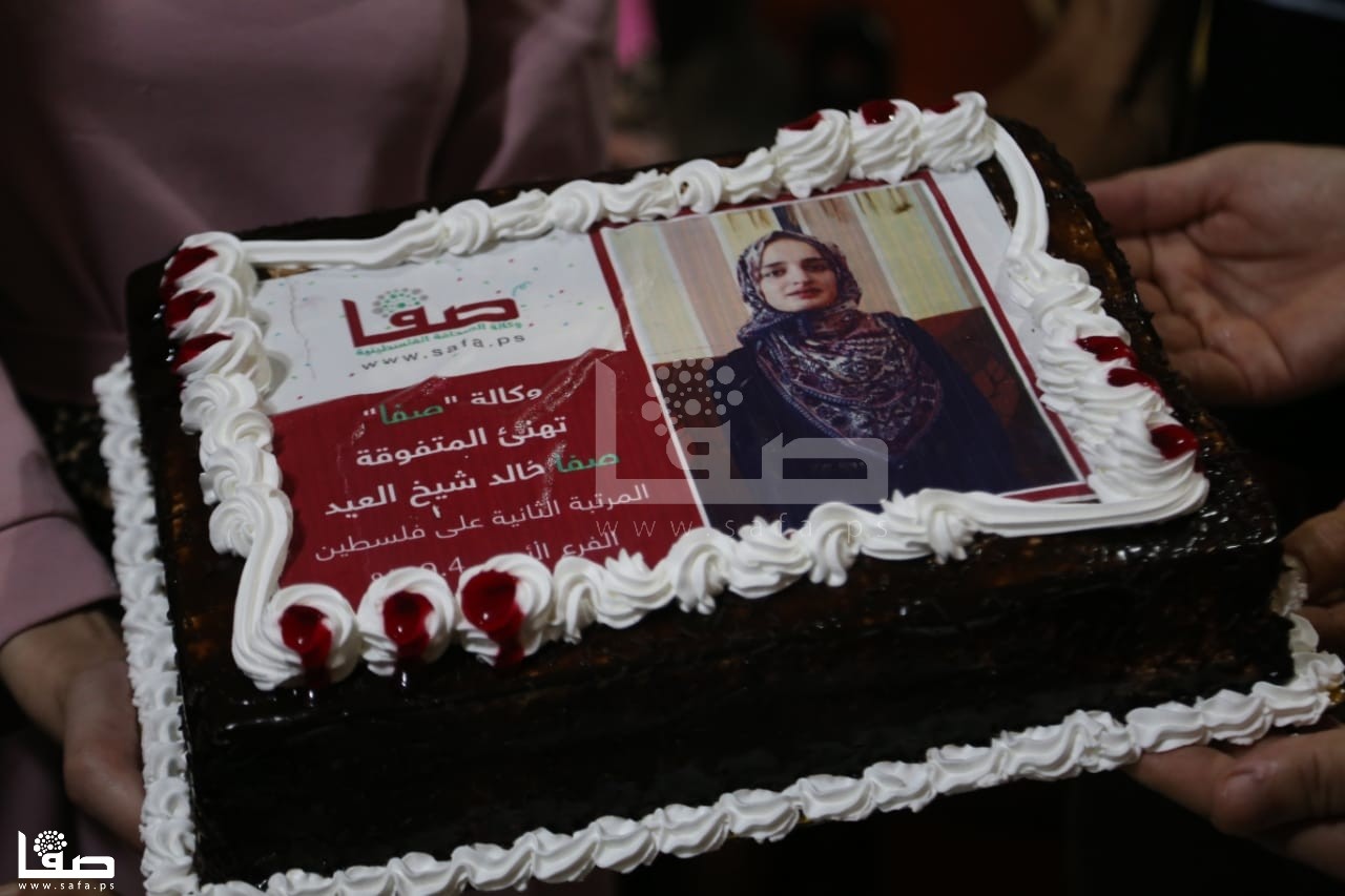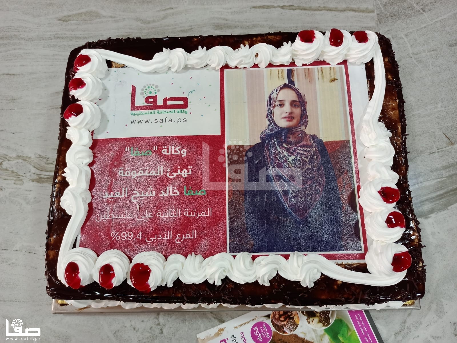 وقدّم الوفد "قالب كيك" نُقِش عليه صورة المتفوقة شيخ العيد، ومعدلها وترتيبها بين المتفوقين، وشعار وكالة الصحافة الفلسطينية صفا.