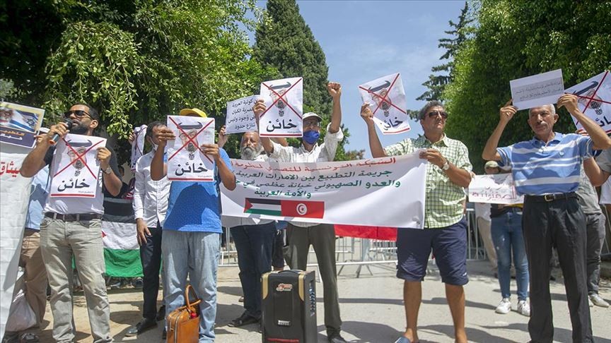 نظم عشرات الأشخاص في شارع الحبيب بورقيبة وسط العاصمة التونسية مساء السبت وقفة احتجاجية رفضًا للتطبيع مع "إسرائيل".