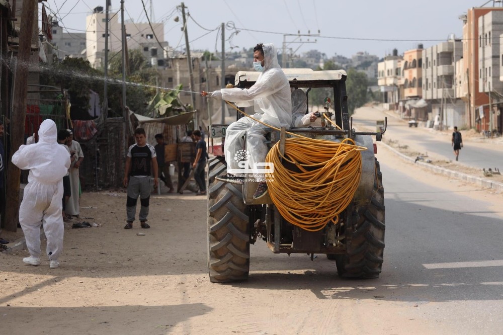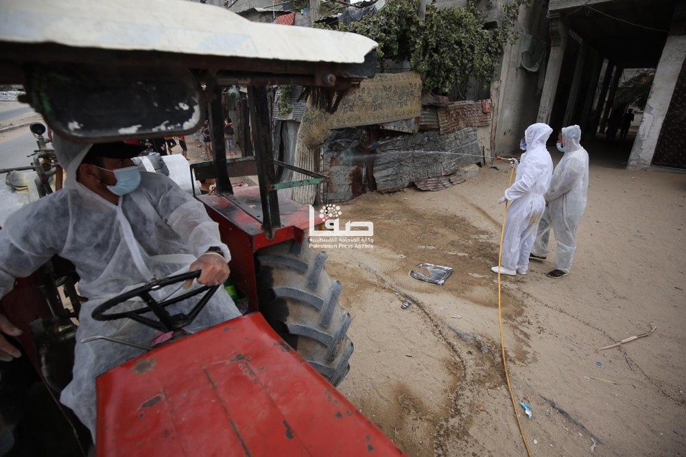 مع استمرار حظر التجوال الكامل في قطاع غزة للحد من تفشي وباء كورونا داخل المجتمع، استخدم مزارعان من بلدة بيت لاهيا شمالي قطاع غزة جرارًا زراعيًا، وسيلة رزقهما الوحيدة، لتعقيم حيهما، ولاسيما بيوت الفقراء.