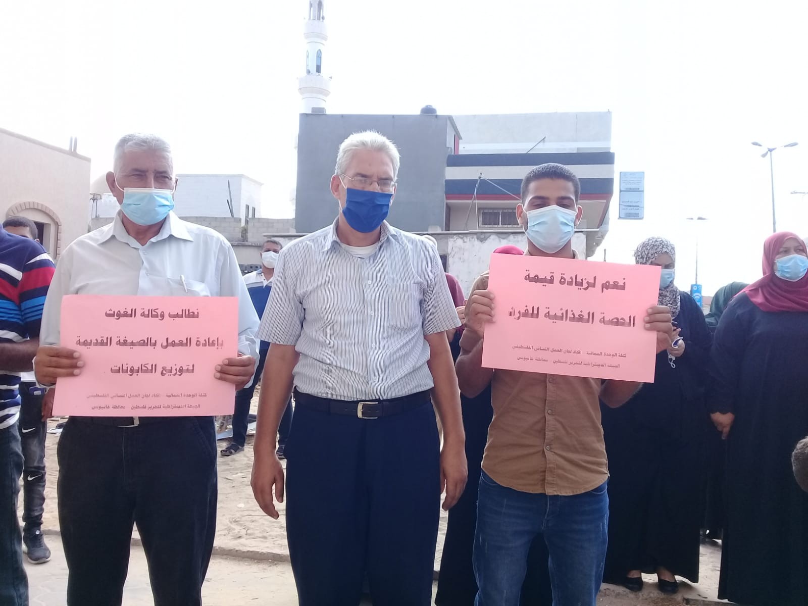 نظمت كتلة الوحدة العمالية واتحاد لجان العمل النسائي الفلسطيني سلسلة اعتصامات أمام مقرات وكالة غوث وتشغيل اللاجئين الفلسطينيين "أونروا" بالمعسكر الغربي ومنطقة معن وعبسان الجديدة والكبيرة بمحافظة خانيونس ومكتب مدير عمليات الوكالة بالمنطقة الجنوبية، لرفض الآلية الجديدة للوكالة بتوزيع المساعدات الغذائية.