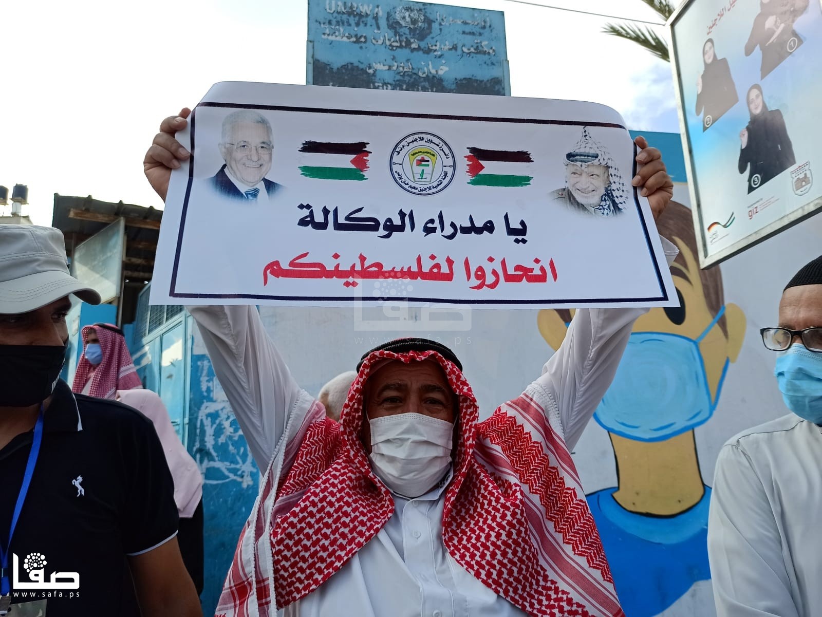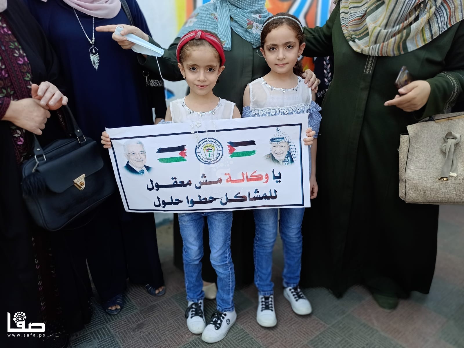 ورفع المشاركون لافتات كتب عليها "أين قرارات المجتمع التي طالبت بحقوق اللاجئين، يا مدراء الوكالة انحازوا لفلسطينكم، أعيدوا برامج الوكالة للصحة والبيئة، لا للتجويع.. لا للتقليص.. لا للظلم ..".