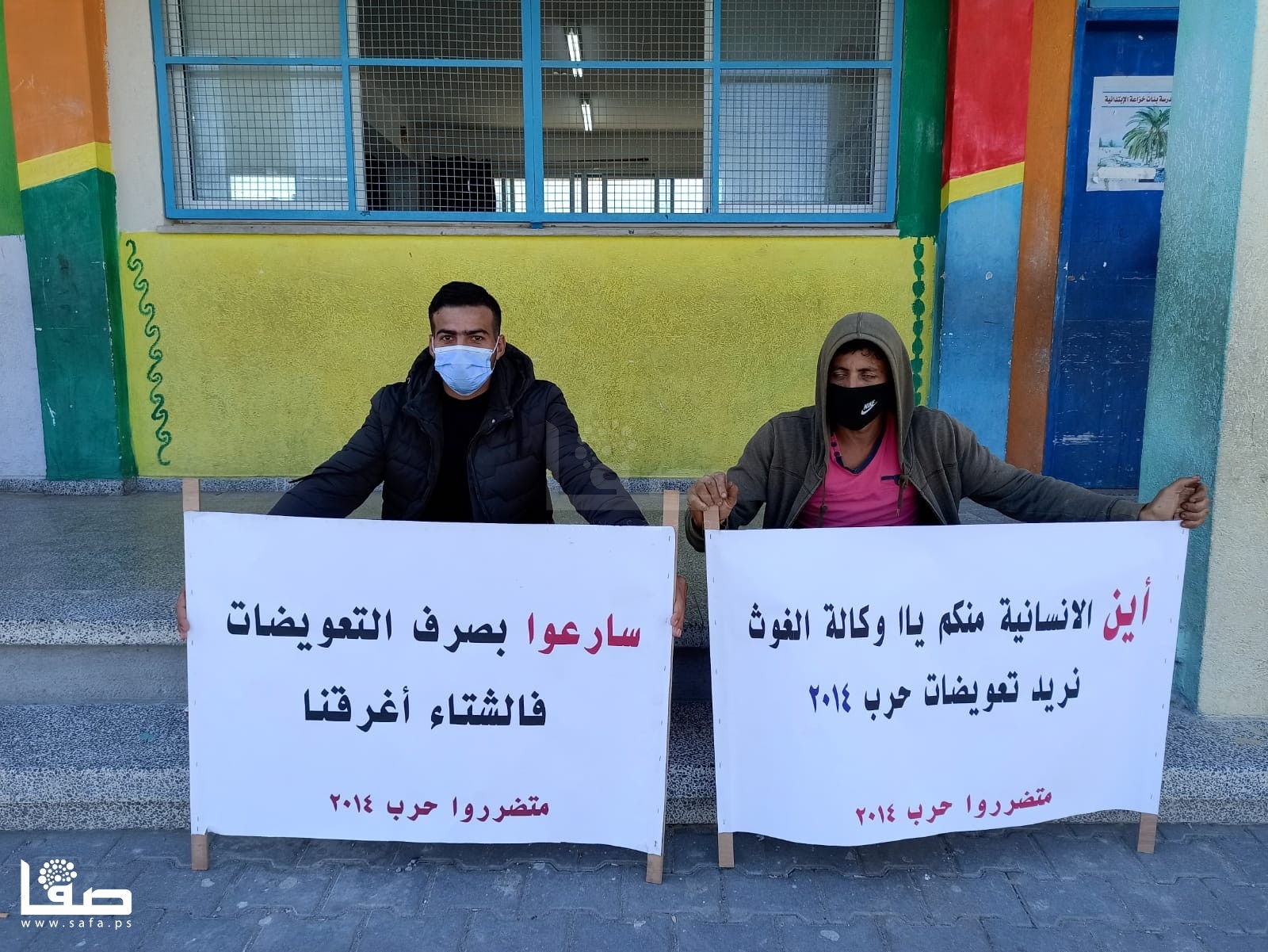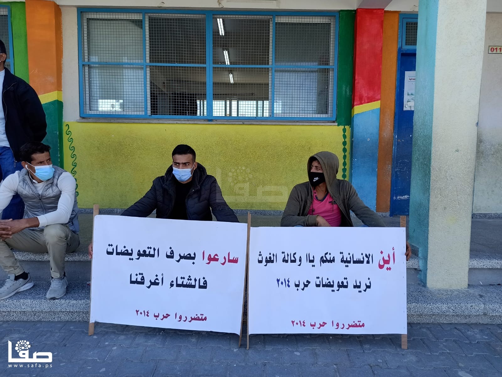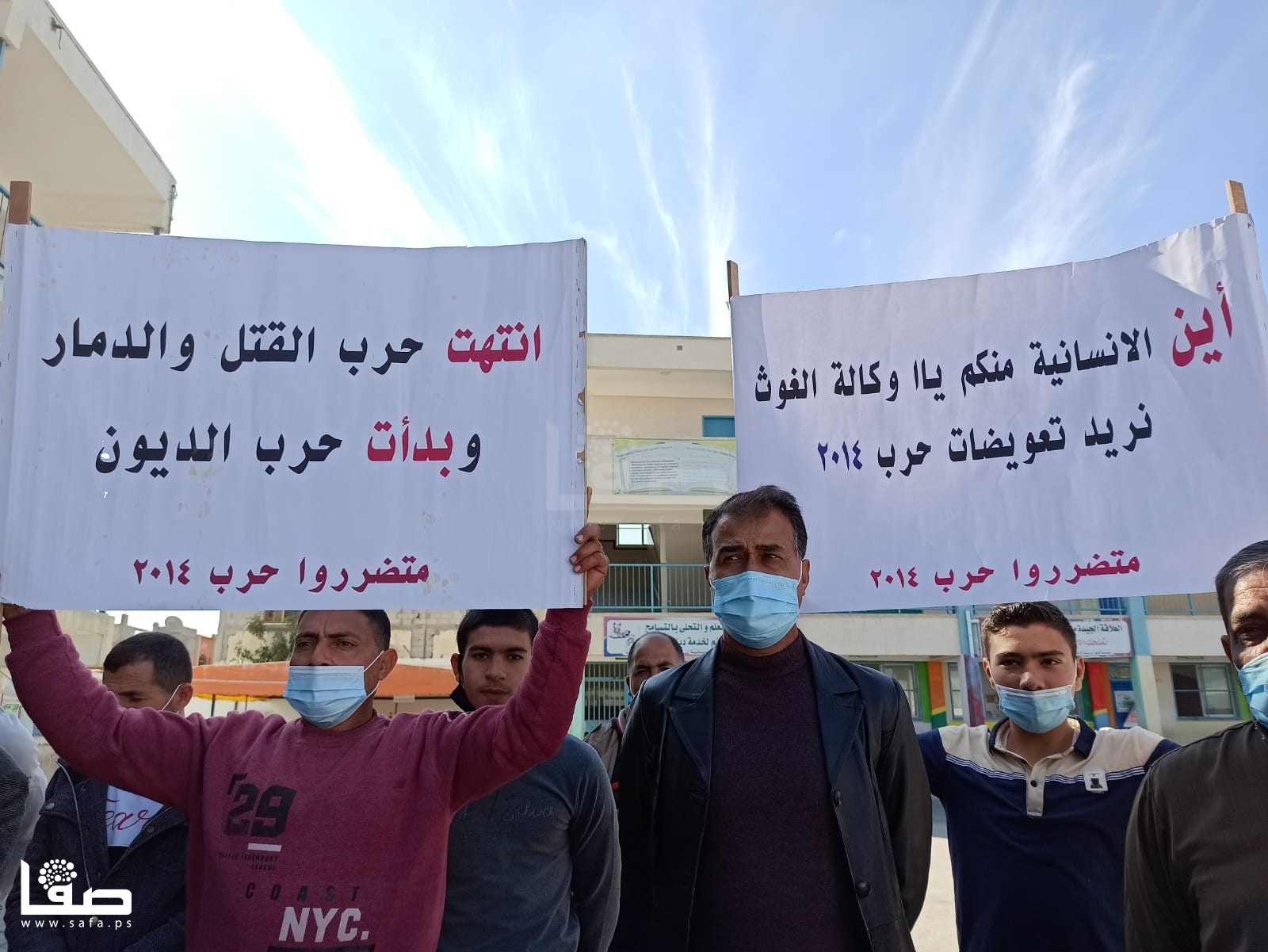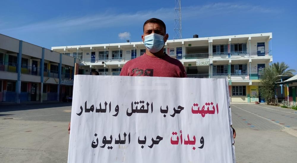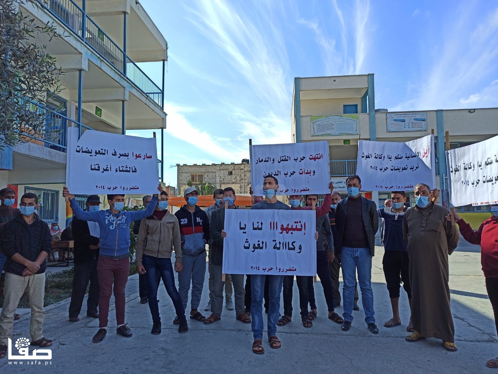 ورفع المشاركون لافتات كتبت عليها، "سارعوا بصرف التعويضات فالشتاء أغرقنا، انتهت حرب القتل والدمار وبدأت حرب الديون، أين الإنسانية منكم يا وكالة الغوث.. نريد تعويضات 2014".