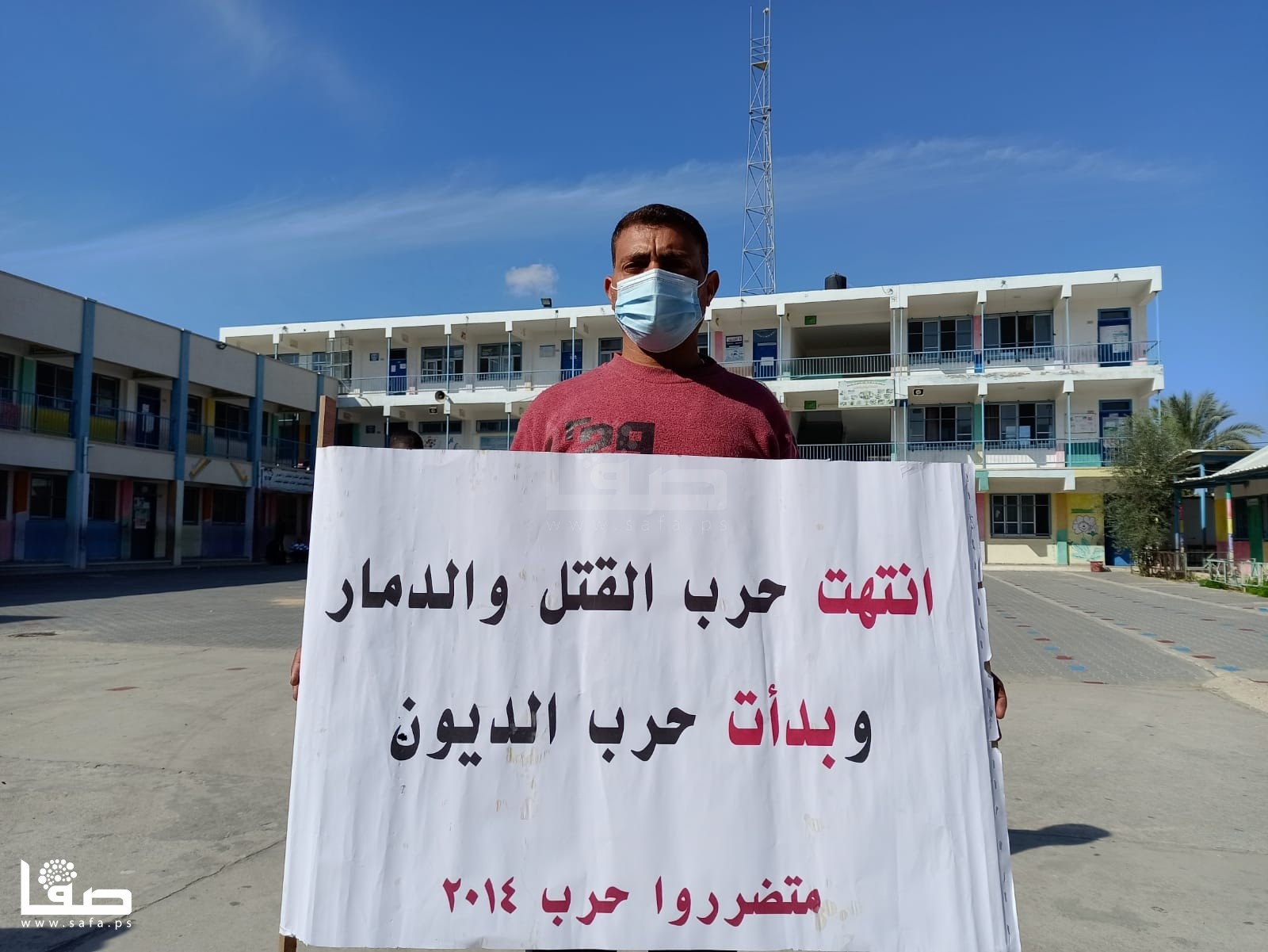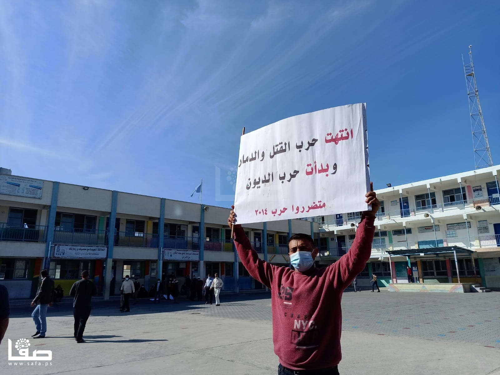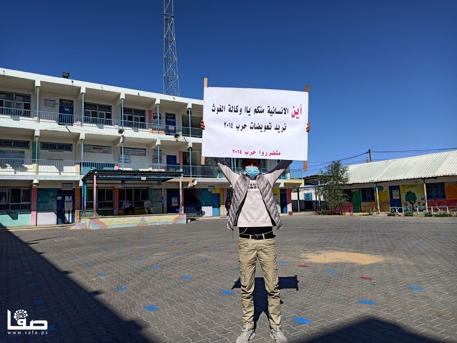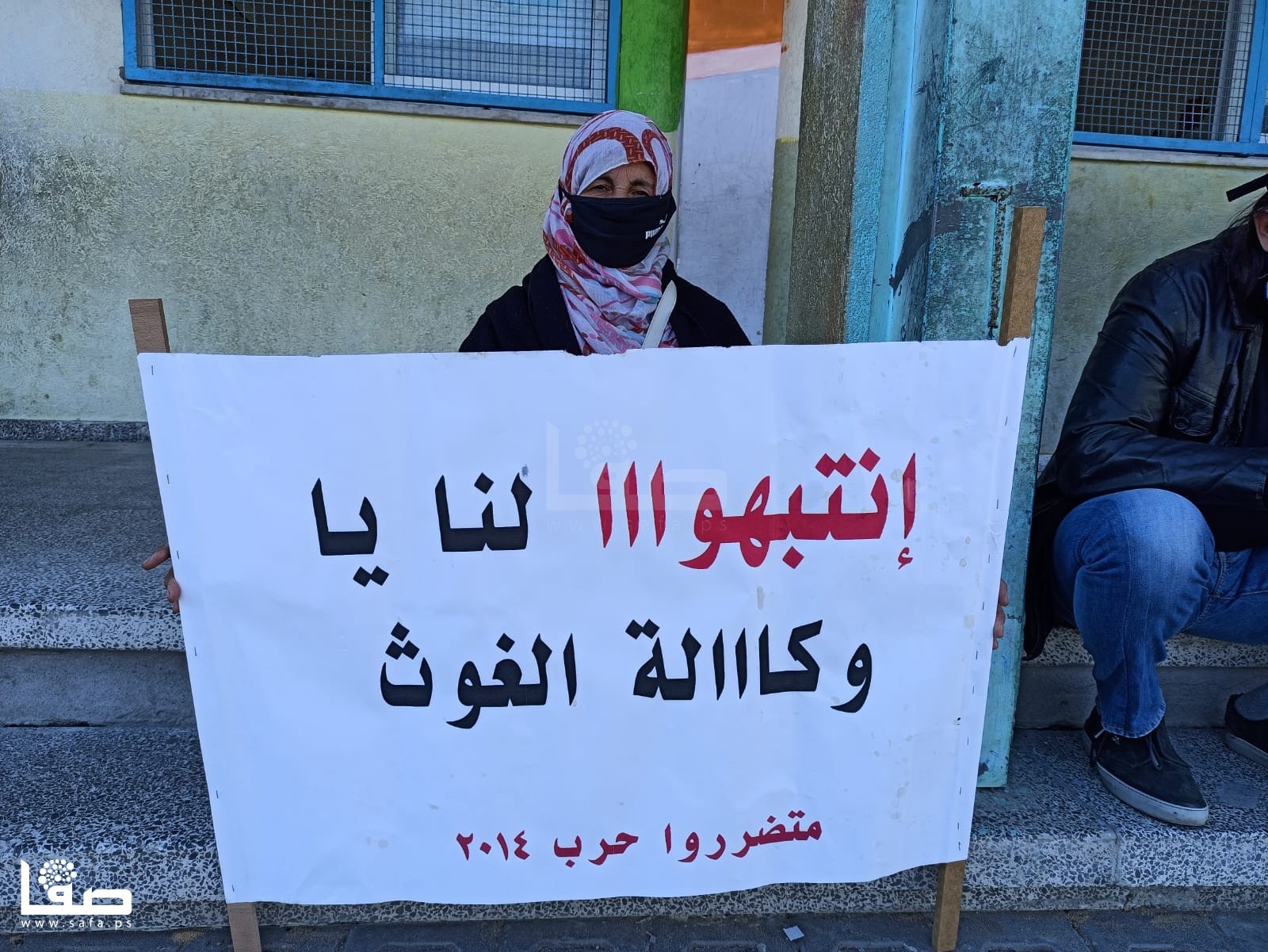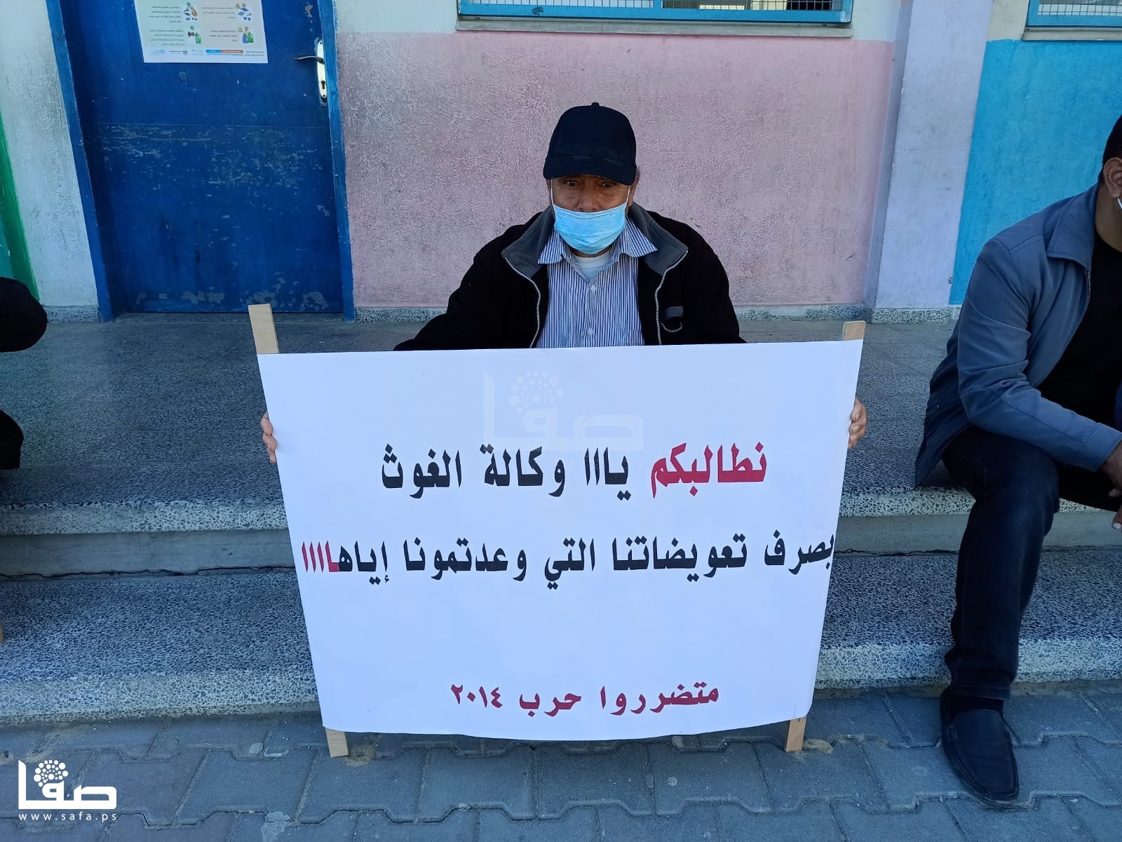 ورفع المشاركون لافتات كتبت عليها، "سارعوا بصرف التعويضات فالشتاء أغرقنا، انتهت حرب القتل والدمار وبدأت حرب الديون، أين الإنسانية منكم يا وكالة الغوث.. نريد تعويضات 2014".
