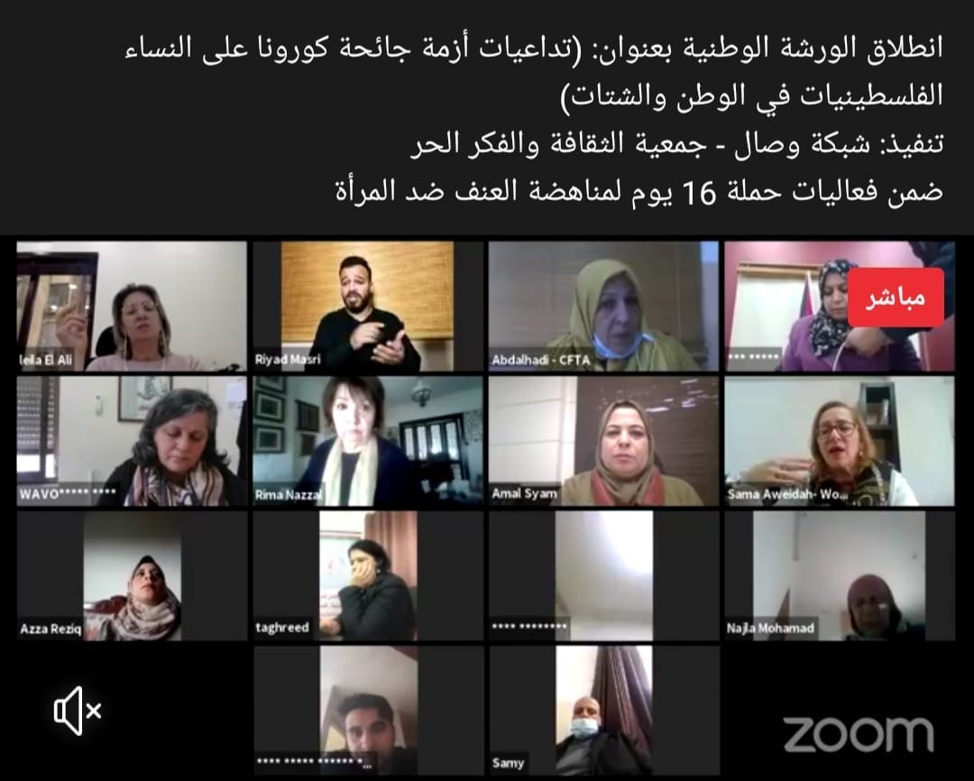 ناقشت قيادات مجتمعية نسوية فلسطينية من القدس والضفة الغربية المحتلتين والأراضي المحتلة عام 1948 وقطاع غزة تداعيات أزمة جائحة كورونا علي واقع النساء الفلسطينيات في الوطن والشتات.