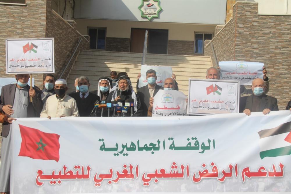 نظمت رابطة علماء فلسطين في قطاع غزة، يوم الخميس، وقفة لدعم الرفض الشعبي المغربي للتطبيع.