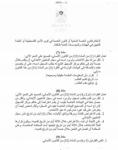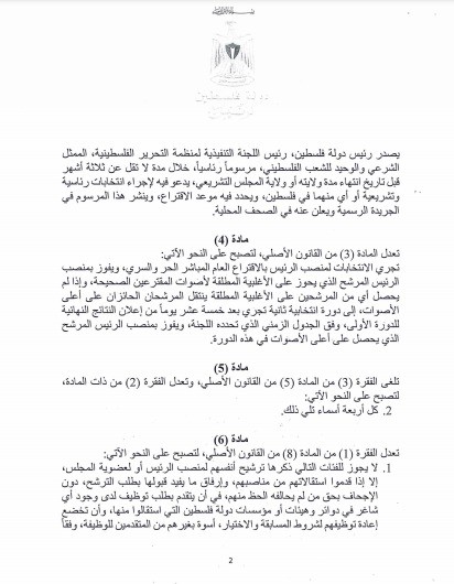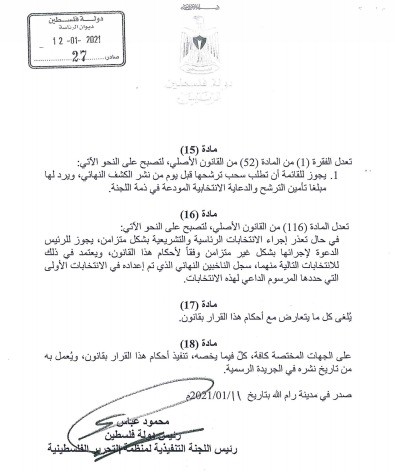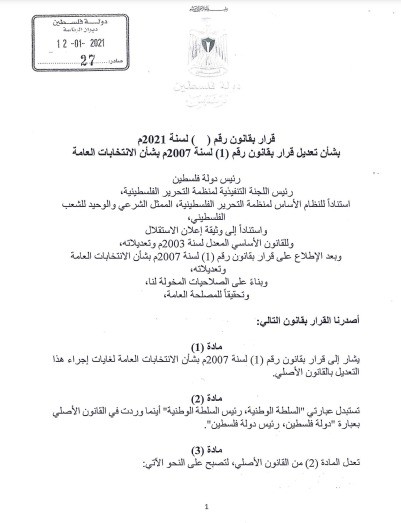 وكان الرئيس محمود عباس أصدر مساء يوم الاثنين الماضي قرارًا بقانون عدل بموجبه قرار بقانون رقم (1) لسنة 2007 بشأن الانتخابات العامة.
