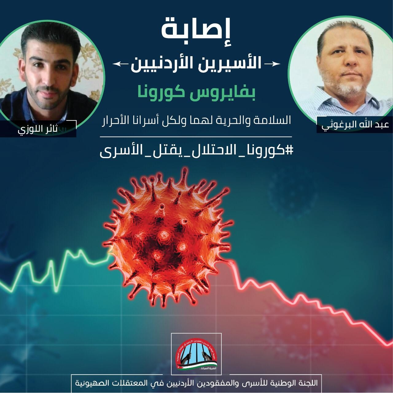 أعربت "اللجنة الوطنية للأسرى والمفقودين الأردنيين في المعتقلات الصهيونية" عن قلقها البالغ إزاء الأنباء عن إصابة الأسيرين الأردنيين عبد الله البرغوثي وثائر اللوزي بفايروس "كورونا"، خاصة في ظل إهمال الاحتلال للأسرى وافتقار الزنازين لمقومات السلامة المطلوبة.