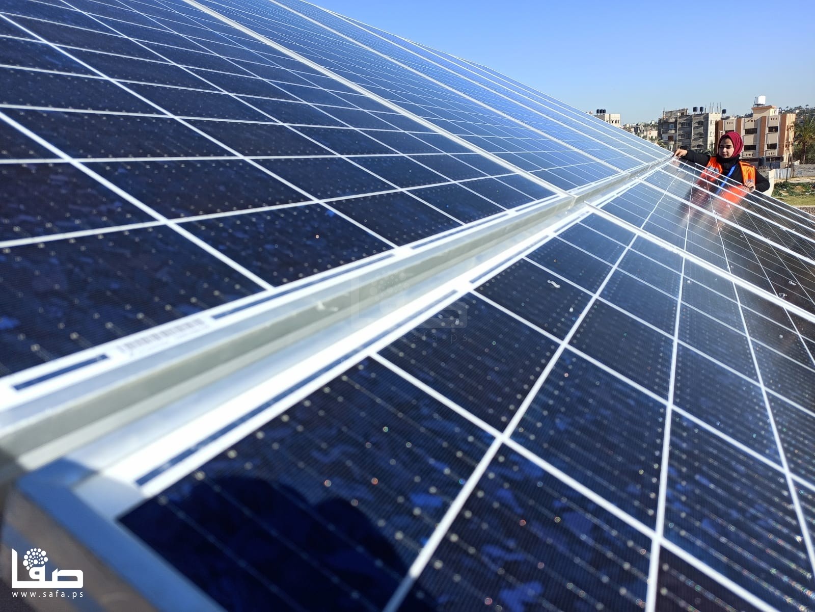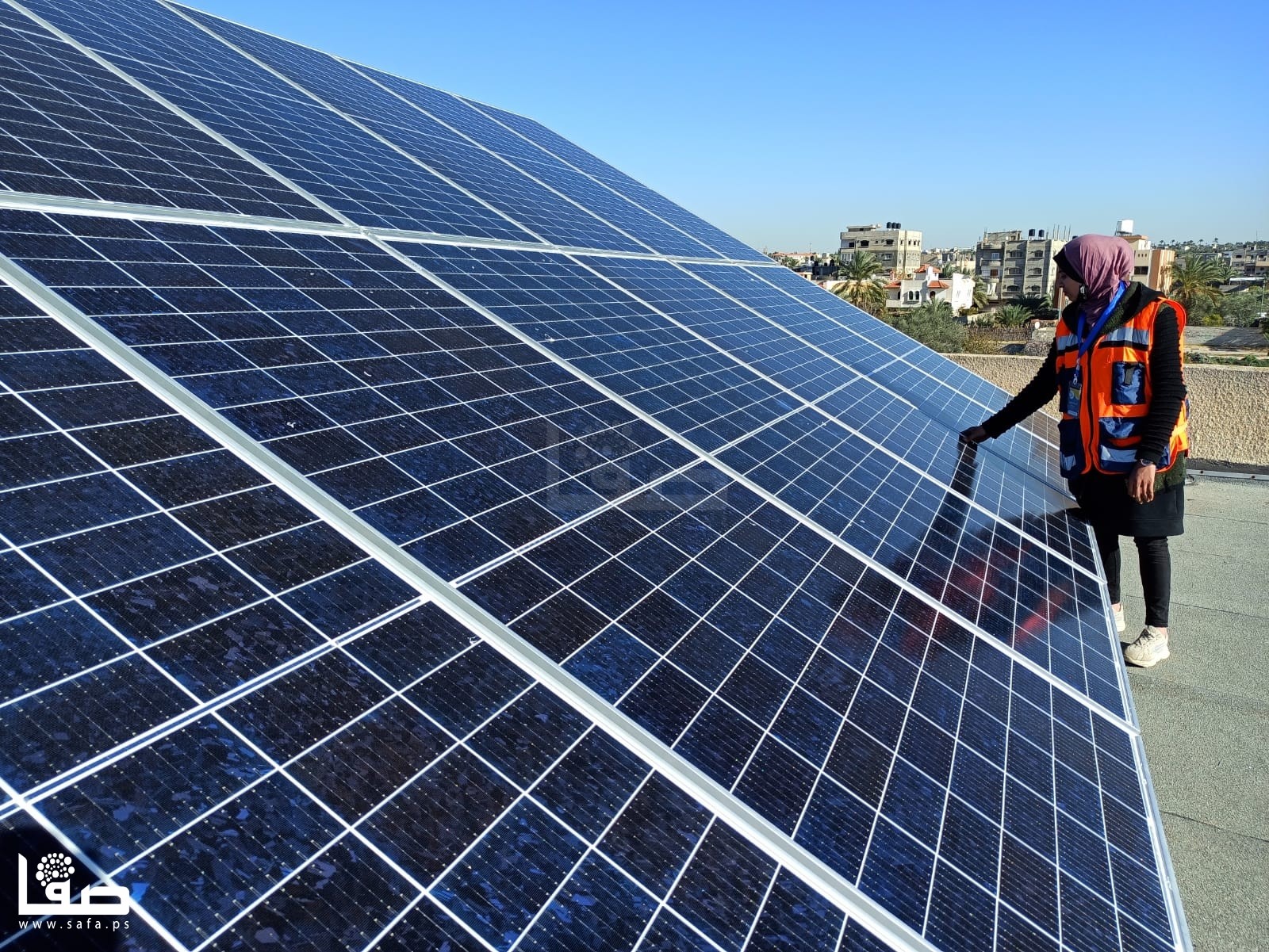 ومع انتصاف نهار مُشمس، التقت مجموعة الشابات اللواتي يتلقينّ التدريب العملي والعمل في آن واحد، على سطح مدرسة "عيلبون" الحكومية ببلدة القرارة، شمال شرقي محافظة خان يونس؛ لتركيب مشروع طاقة لصالح محطة تحلية داخل المدرسة.