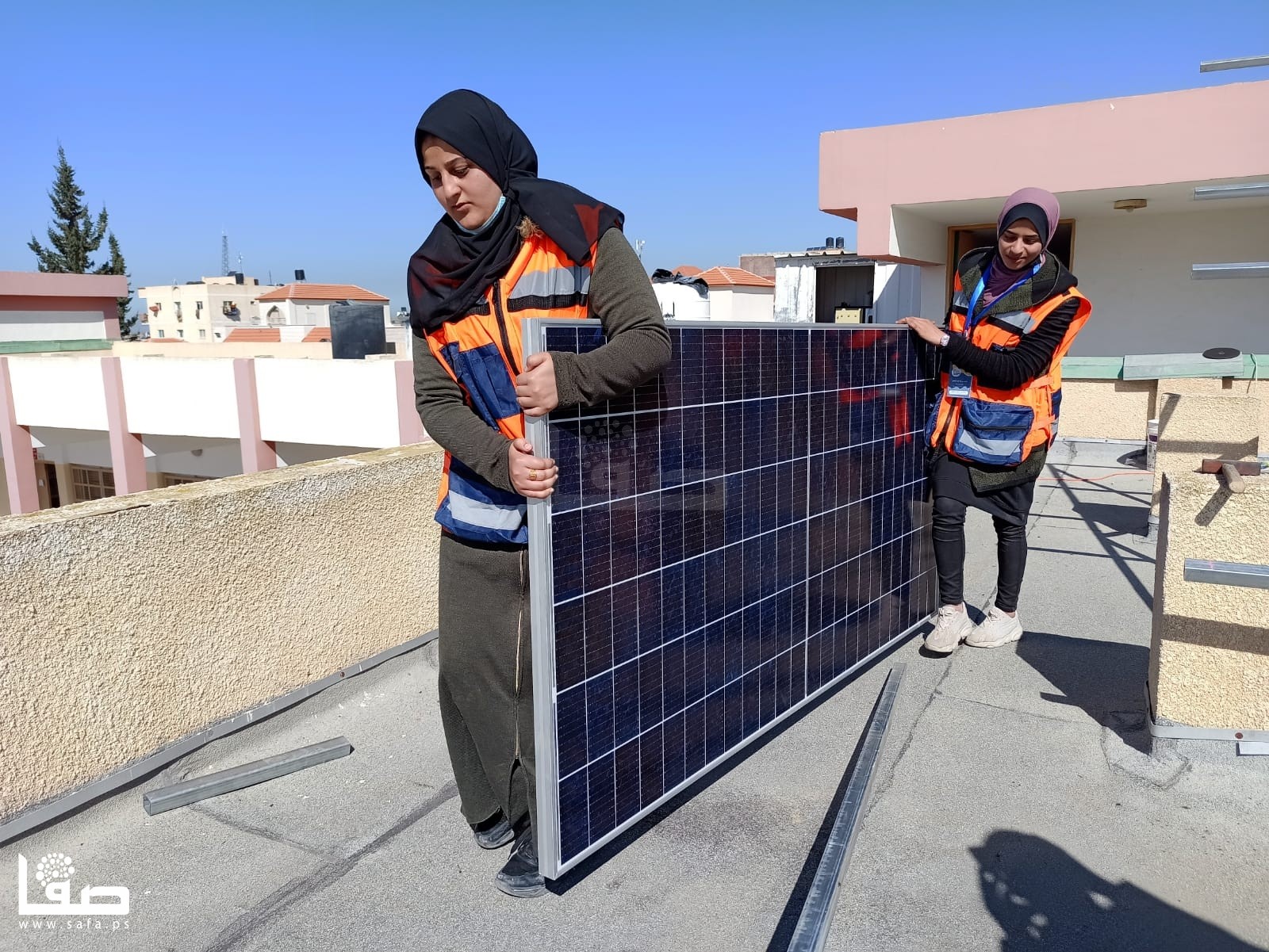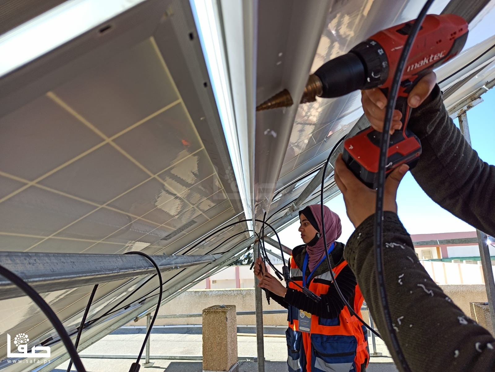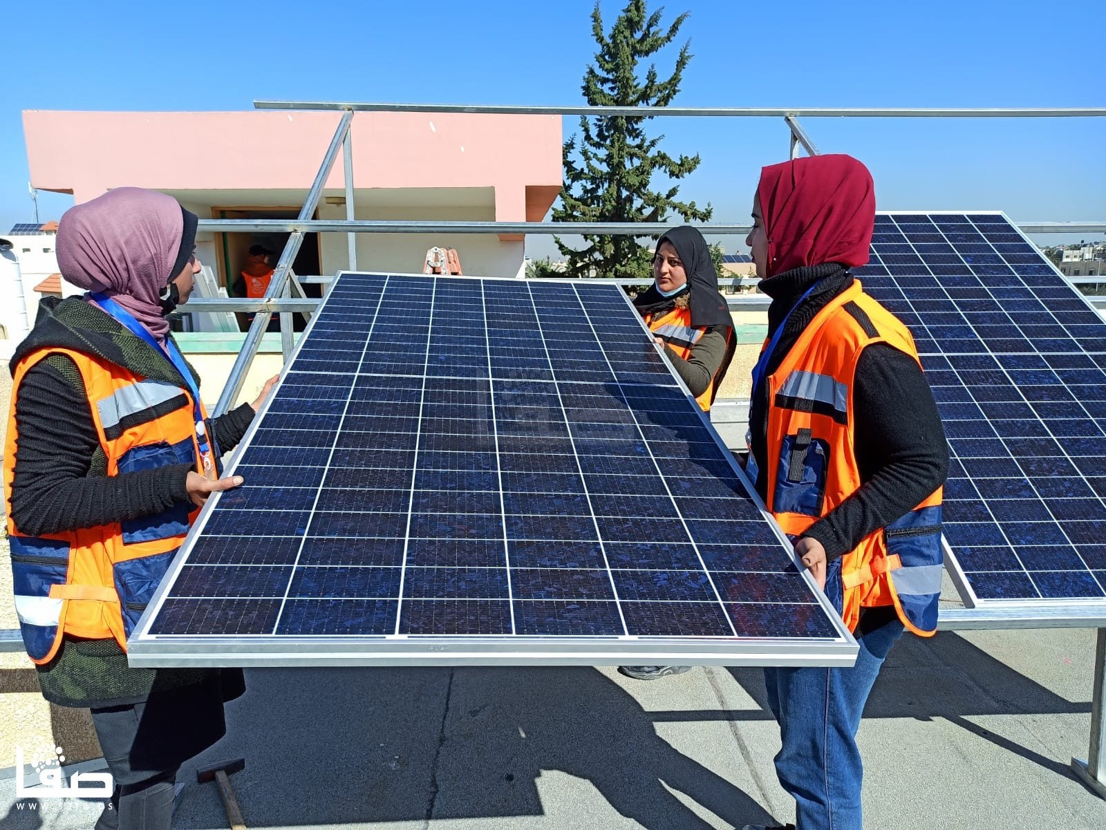وعلى مدار ساعات العمل تحت أشعة الشمس، شاركت الشابات فريق عمل من الشباب المختصين في مجال الطاقة الشمسية في تجهيز 12 خلية شمية، من حيث حمل الألواح وتركيبها وتمديد الكوابل، وتجميع الخطوط "طبلون".