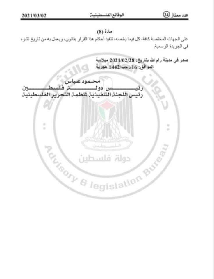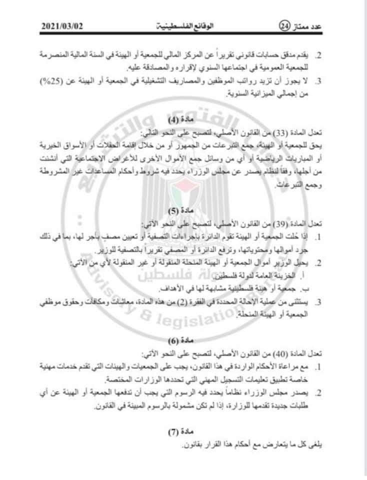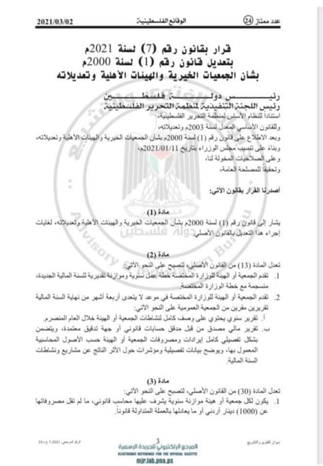 طالبت الهيئة الدولية لدعم حقوق الشعب الفلسطيني (حشد) بإلغاء القرار بقانون رقم 07 لسنة 2021 المعدل لقانون الجمعيات الخيرية والهيئات الأهلية رقم 01 لسنة 2000، الذي أصدره الرئيس محمود عباس، والمنشور في العدد 24 الممتاز من مجلة الوقائع الفلسطينية وذلك بتاريخ 02/03/2021.