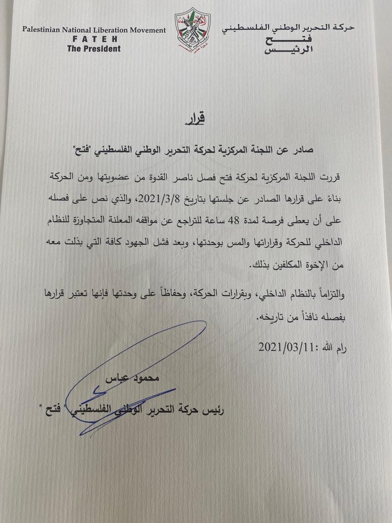 أعلنت اللجنة المركزية لحركة فتح عن قرارها بفصل ناصر القدوة من عضويتها ومن الحركة بناء على قرارها الصادر عن جلستها بتاريخ 8-3-2021، والذي نص على فصله.