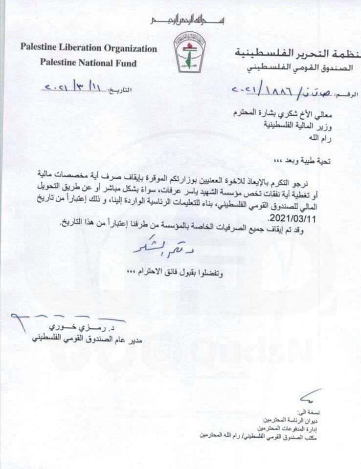 وأفادت المصادر بأن مدير عام الصندوق القومي الفلسطيني رمزي خوري خاطب وزير المالية في الحكومة الفلسطينية شكري بشارة، بكتاب جاء فيه "نرجو الإيعاز بالتكرم للإخوة المعنيين بوزارتكم الموقرة بإيقاف صرف أية مخصصات مالية أو تغطية أية نفقات تخص مؤسسة الشهيد ياسر عرفات".